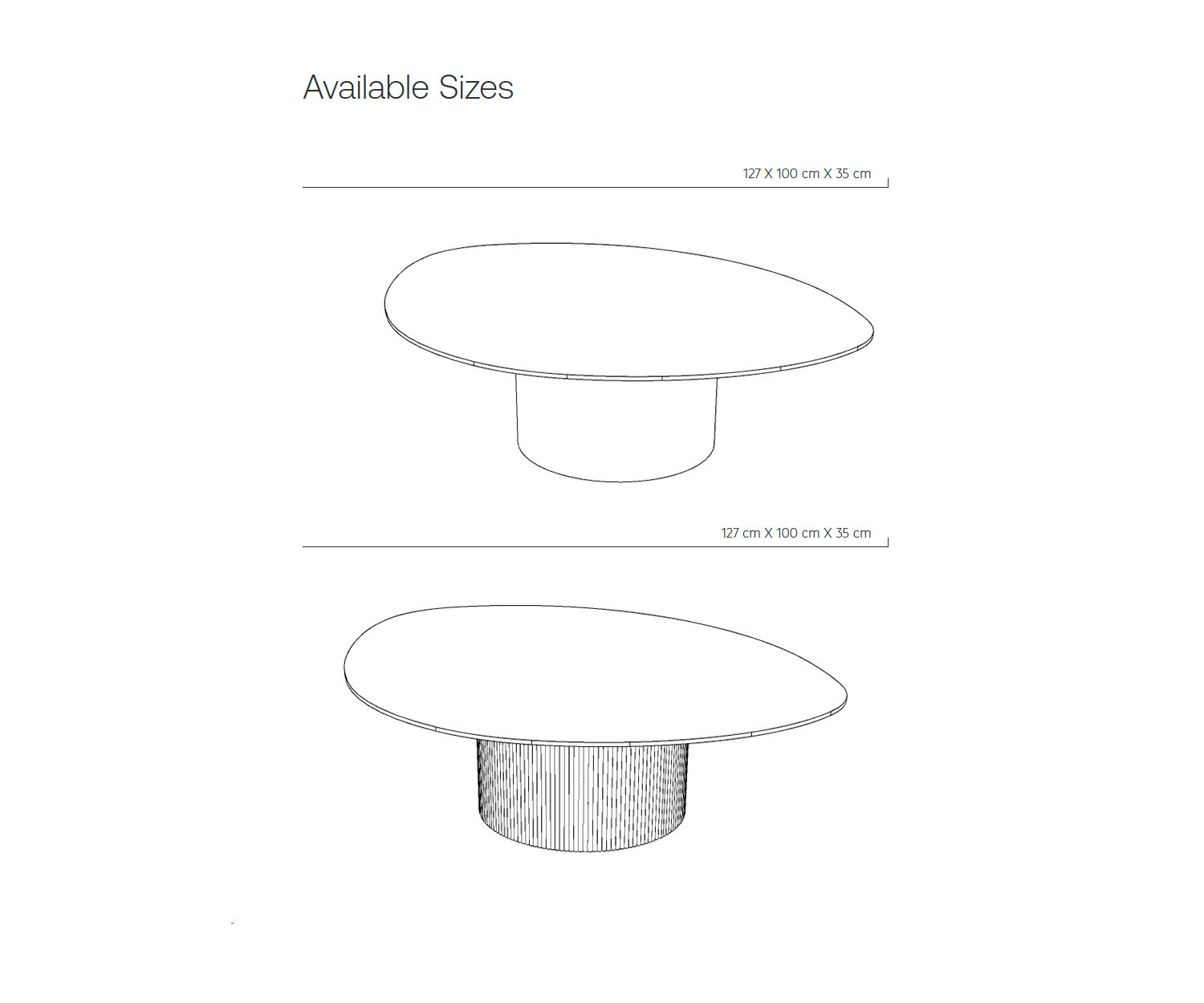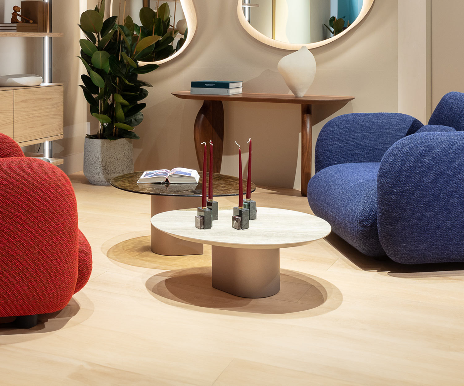 Het organisch gevormde tafelblad is verkrijgbaar in hoogwaardig houtfineer of robuust keramiek en verleent de tafel, afhankelijk van de uitvoering, een warme natuurlijkheid of moderne elegantie