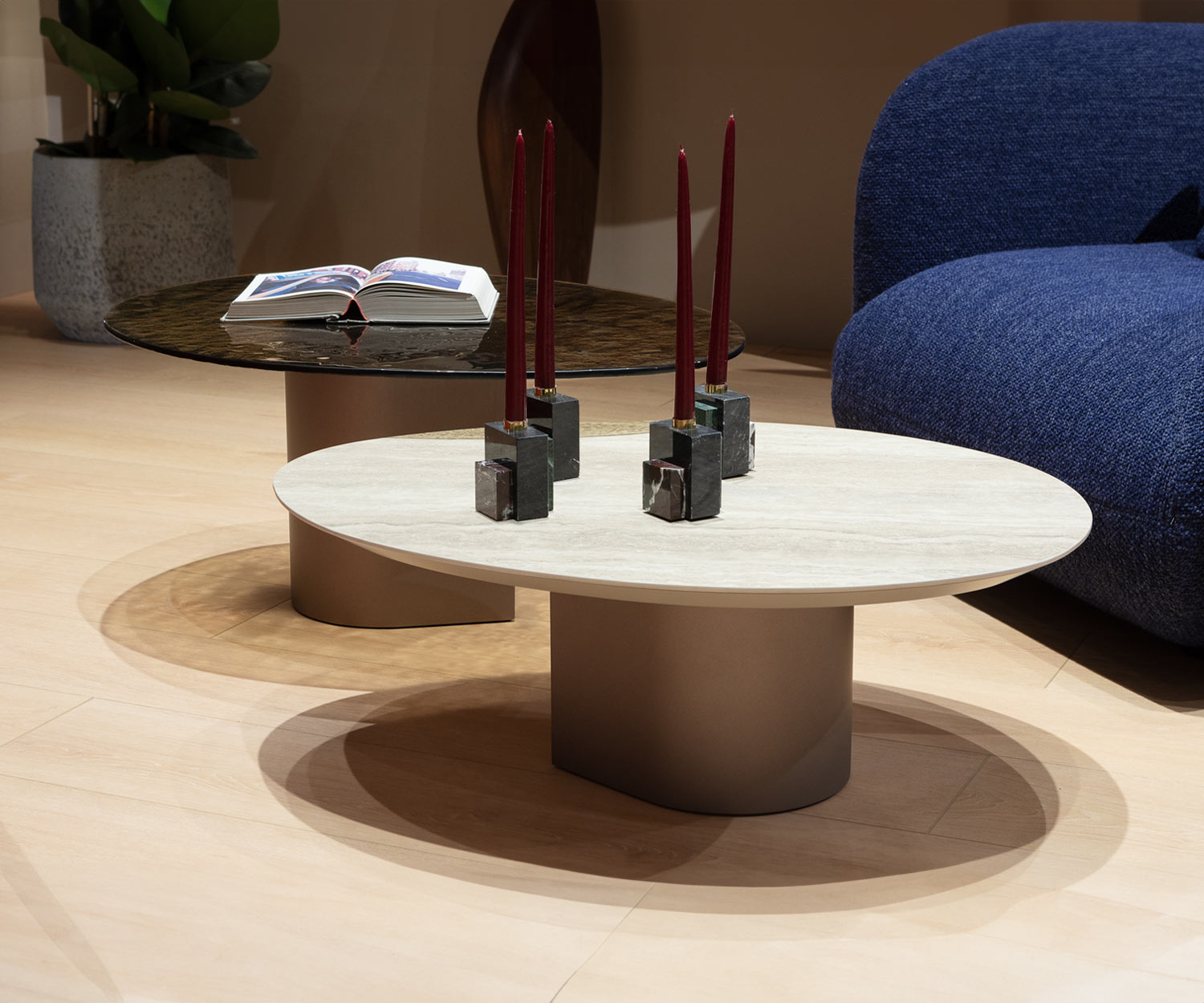 De salontafel Dakry 006 van al2 maakt indruk met zijn ongewone ontwerp dat elegantie en speelsheid harmonieus combineert. Het centrale, druppelvormige onderstel is een karakteristiek kenmerk dat niet alleen visueel opvallend is, maar ook functioneel - het creëert maximale beenruimte en nodigt uit tot gezellig samenzijn.