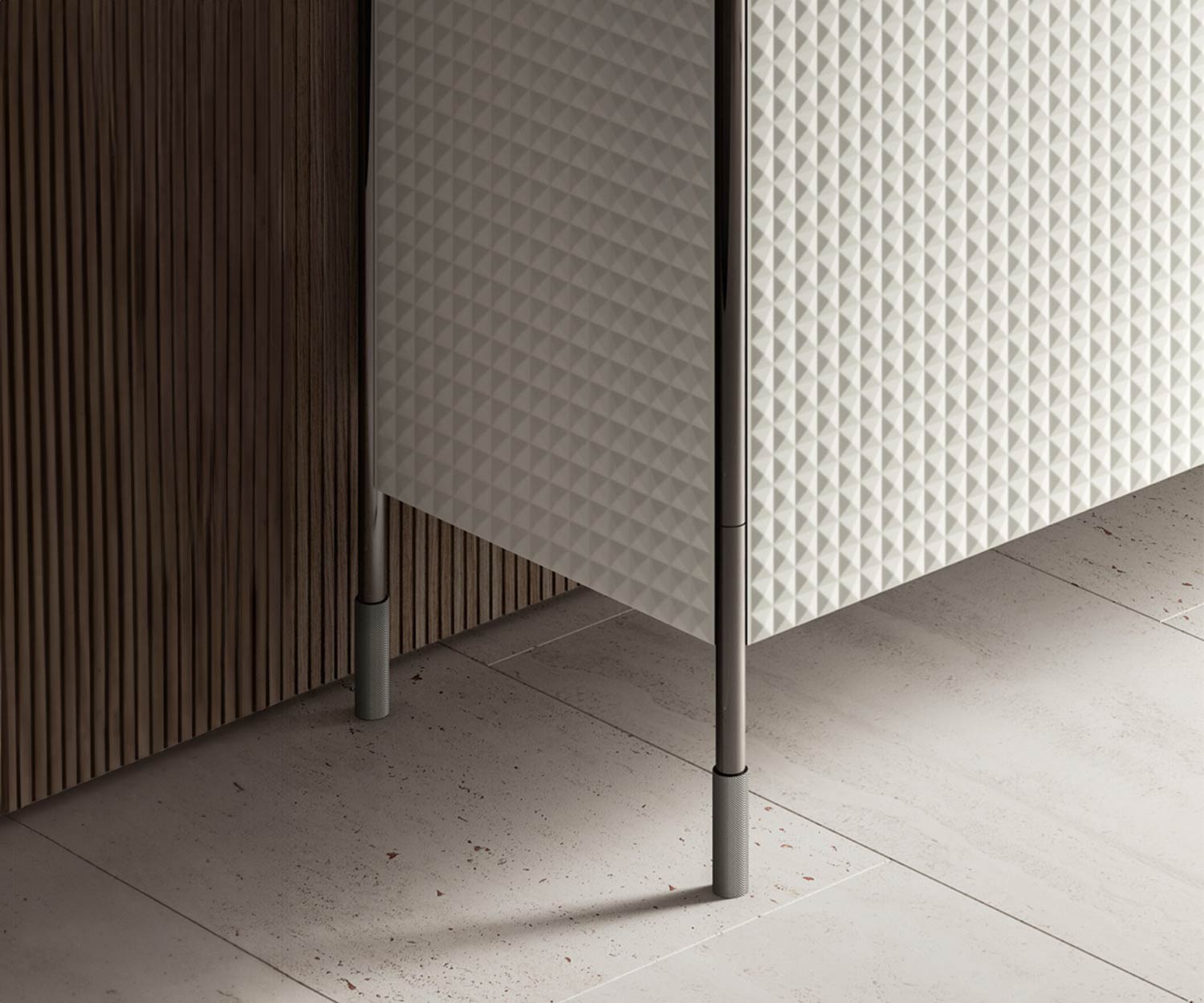 De afdekplaat is 0,7 cm lager dan de buitenzijden voor de deuropening. Om te voorkomen dat het dressoir doorbuigt, Op de bodemplaat zijn twee verstevigingsbuizen gemonteerd. Onder de afdekplaat kan een LED-lamp met stroomkabels en inschakelsysteem worden geïnstalleerd. energieleidingen en inschakelsysteem (meerprijs voor LED-verlichtingssysteem) kunnen als optie worden aangevraagd.