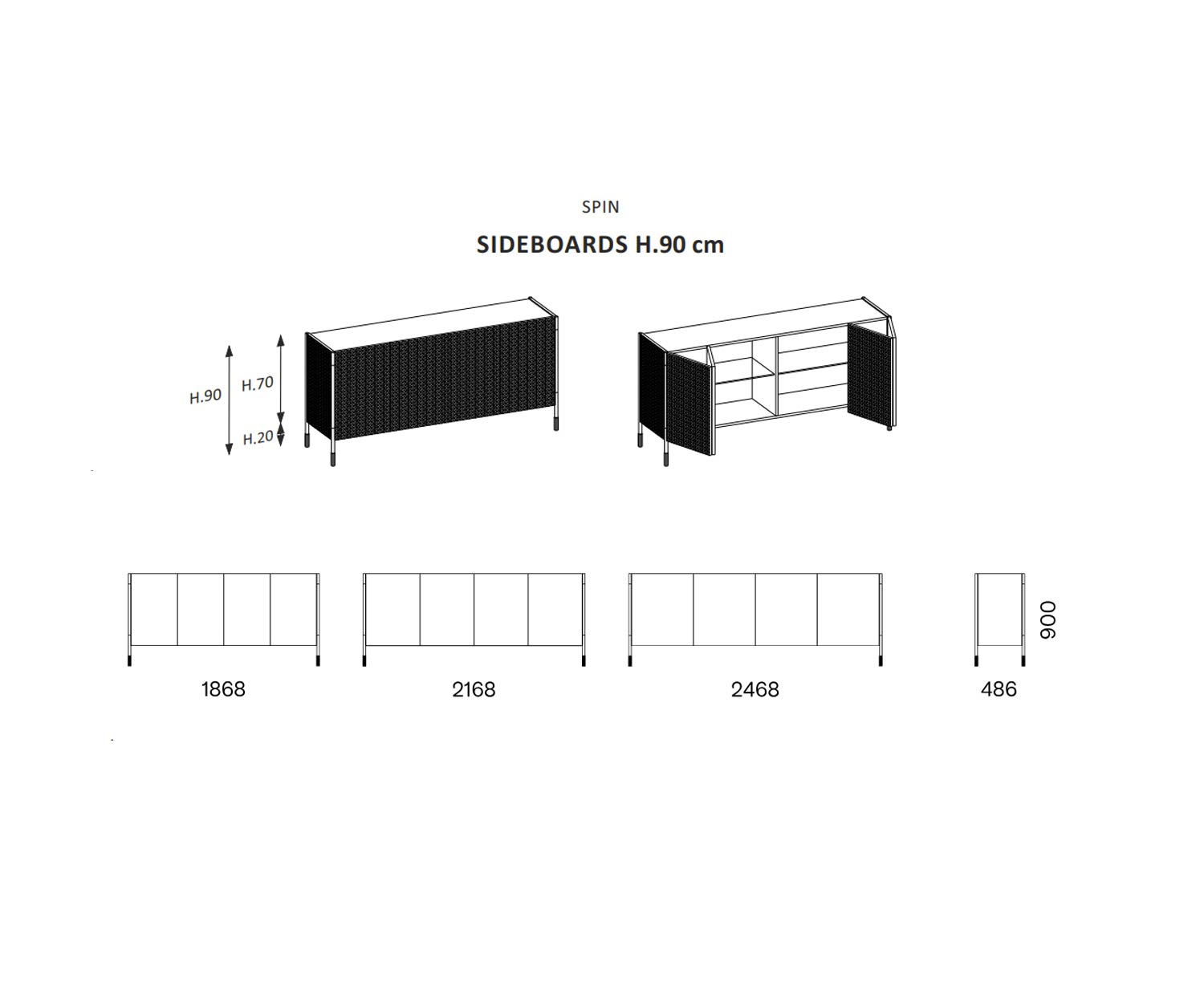 Het kastelement van het Spin dressoir is verdeeld intwee compartimenten. Deze worden gescheiden door 2 verstelbare legplanken van grijs glas. Er is veel ruimte voor opslag.Het Capo d'Opera dressoir Spin is verkrijgbaar in drie verschillende breedtes: een kleine, compacte 186,8 cm brede versie, een iets groter model met een breedte van 216,8 cm of het grote model met een breedte van 246,8 cm.