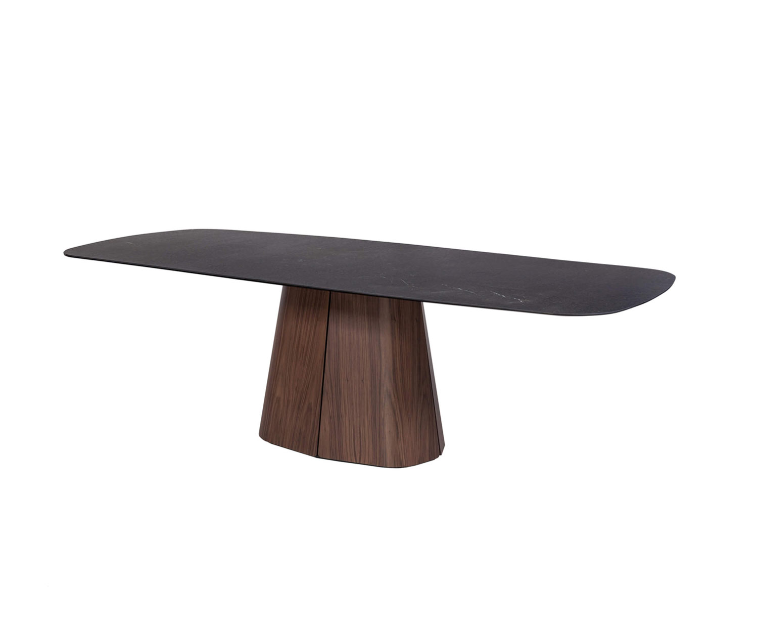 La table de salle à manger design al2 tessera 001 est composée de deux parties : le plateau de table et le pied de table. Le plateau de table lui-même est de forme ovale.