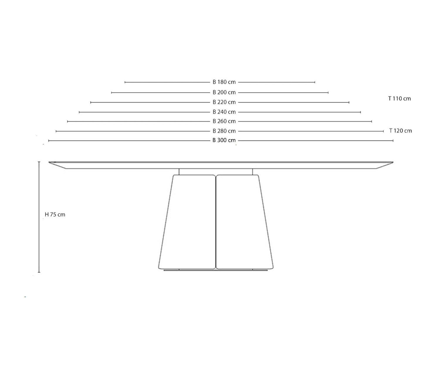 La table de salle à manger tessera 001 en céramique ou en bois d'al2 est disponible en 7 largeurs différentes :
