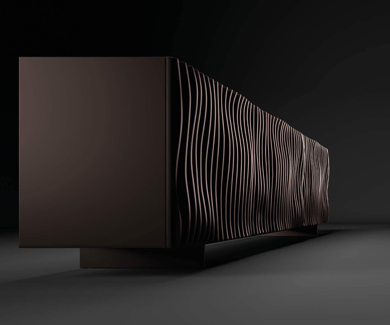 Les portes et le corps sont en bois laqué noble, parfaitement assortis. Les façades de différentes épaisseurs au design ondulé créent un jeu d'ombre et de lumière fascinant - subtil mais efficace. La finition précise souligne l'impression de qualité de ce meuble.