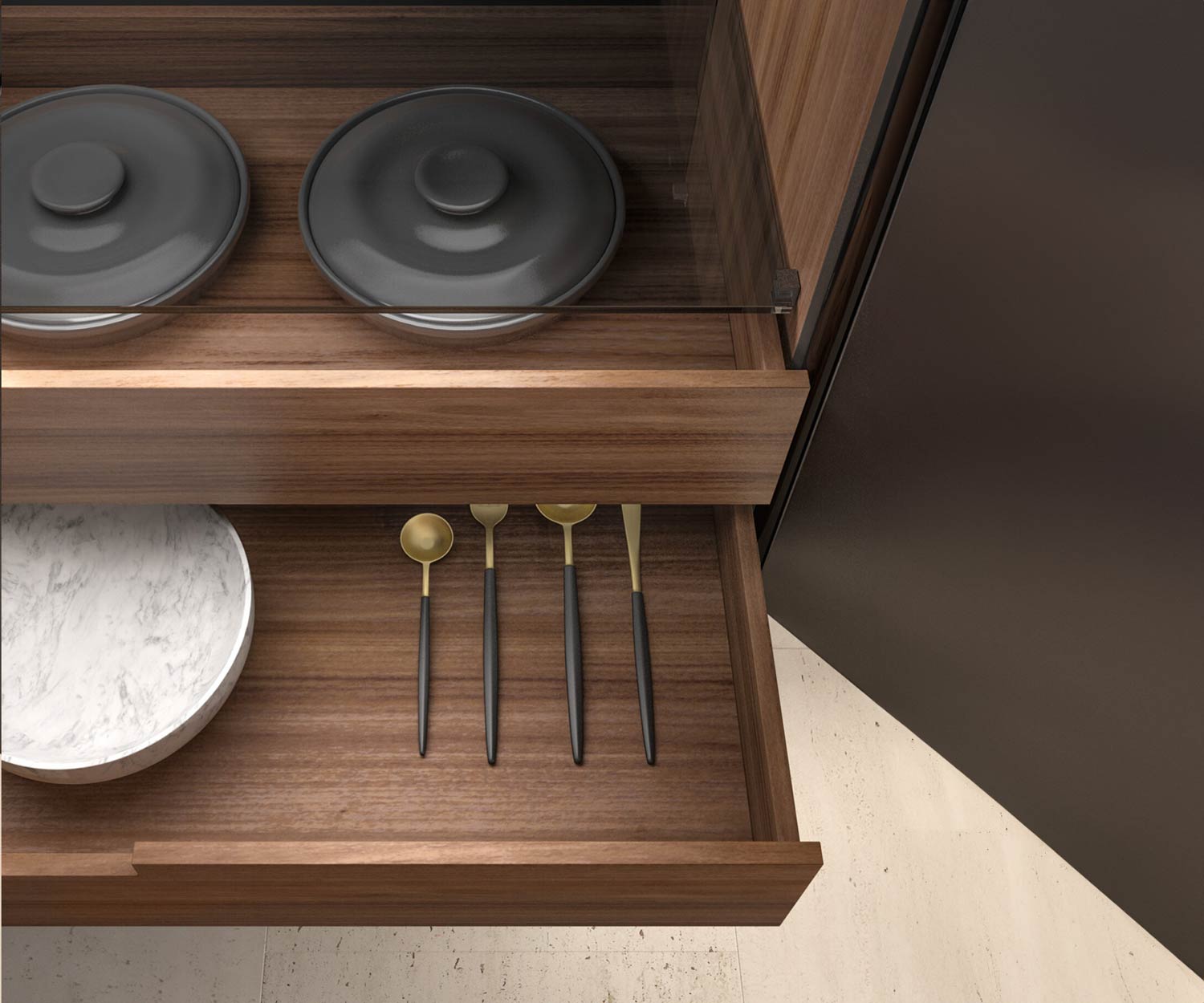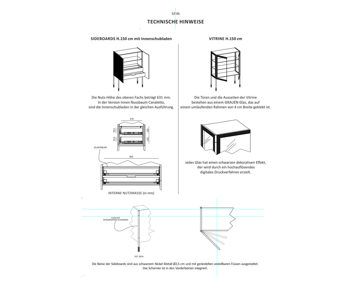 Le corps du buffet haut Capo d'Opera Spin sans tiroirs est laqué à l'intérieur en couleur mate assortie aux façades et aux côtés. Les 3 compartiments de rangement sont séparés par 2 étagères en verre teinté gris. Le highboard Spin avec 2 tiroirs intérieurs est disponible en noyer à l'intérieur et pour les tiroirs intérieurs.