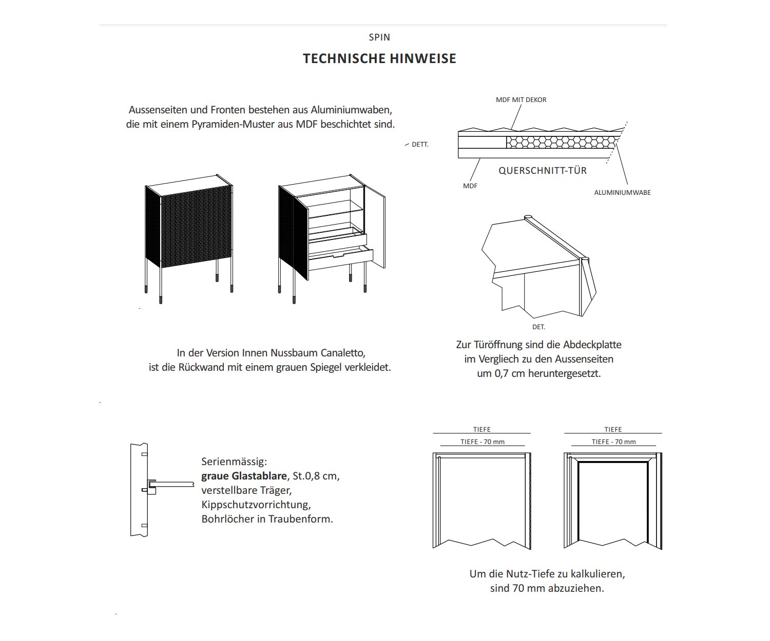 Les portes du buffet sont composées d'un panneau MDF de haute qualité, avec des façades et des côtés en aluminium alvéolé solide. Le corps du highboard Spin est disponible en 6 couleurs mates: aqua, beige, blanc, gris clair, gris foncé et noir. Il vous suffit de sélectionner la couleur de votre choix dans le menu de configuration pour configurer votre nouveau sideboard dans un design personnalisé.