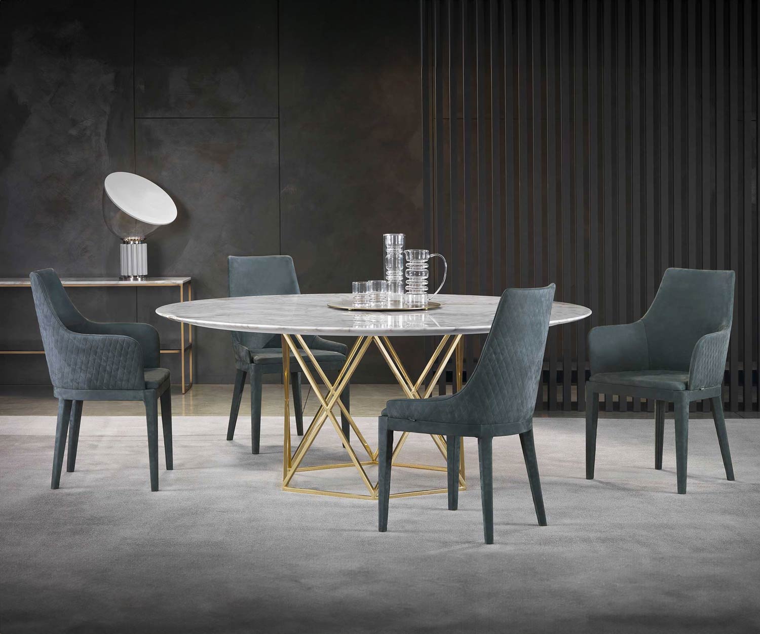 Le plateau de cette table de salle à manger de luxe de Marelli est en marbre italien de qualité supérieure. Les variétés proposées sont : Marbre Carrara blanc, Marbre Marquinia noir, Marbre Emperador brun, Calacatta or ou Marbre Black & Gold. Les pieds du piètement sont en métal et laqués dans une couleur mate ou brillante. Ces couleurs sont disponibles en RAL 9017 noir mat, RAL9016 blanc, chrome brillant, noir chrome brillant, or laqué mat ou laiton brillant Si une imprégnation est choisie en option, elle sera réalisée en X-Stone ou en Polyester Coating.