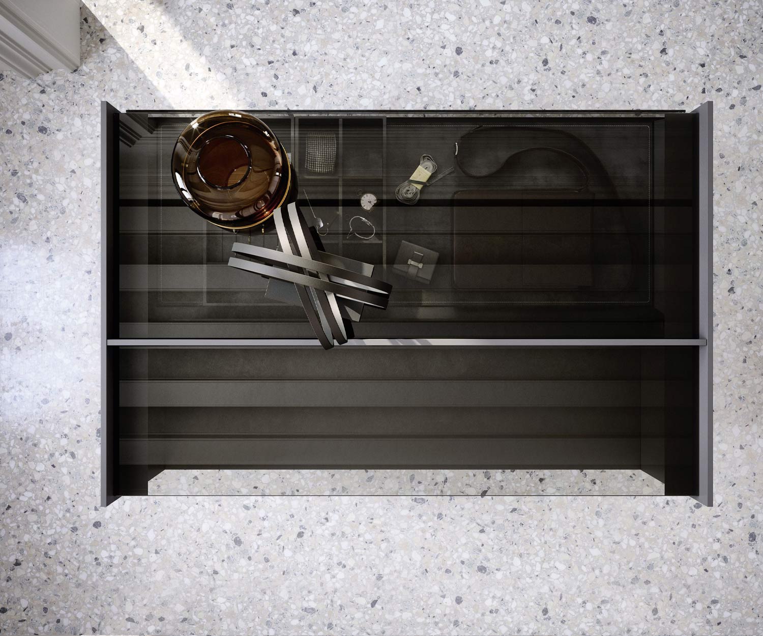 Les deux étagères supérieures des tiroirs coulissants avec façade en verre sont disponibles en anthracite foncé (similaire à RAL7016).