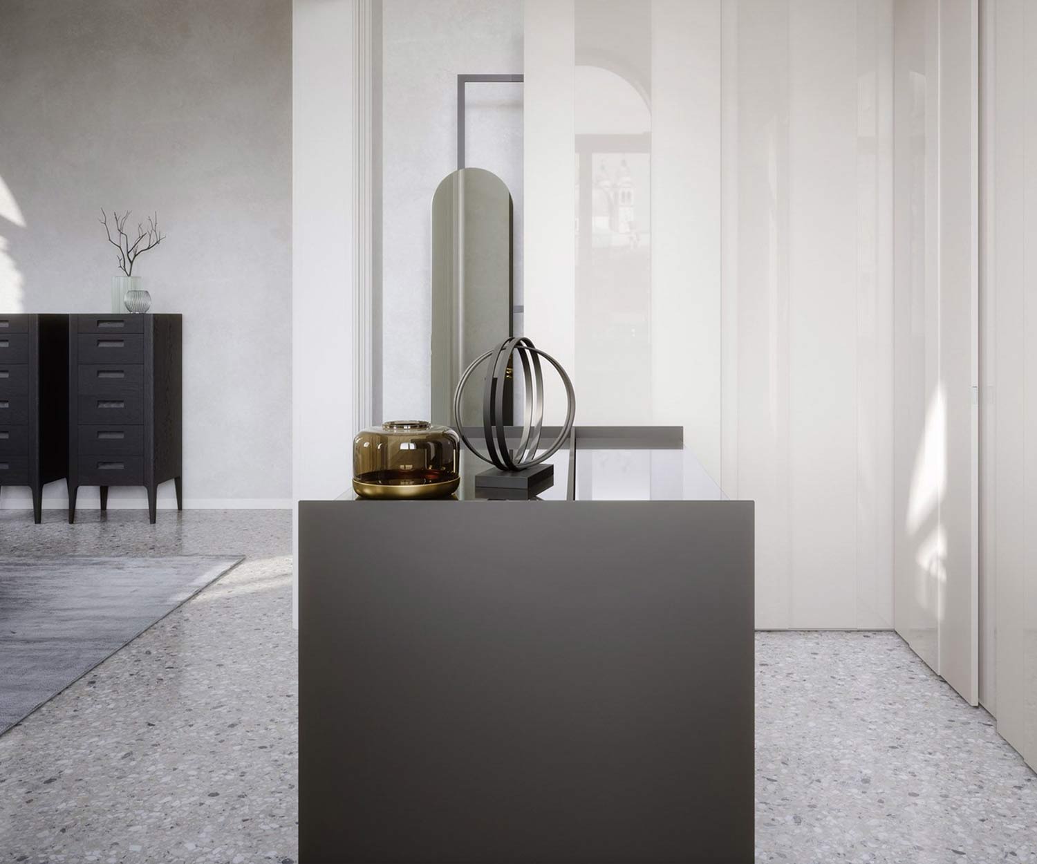 L'îlot penderie Aristotele est disponible en blanc mat Bianco (similaire à RAL 9016), beige mat Sabbia (similaire à RAL 1019) et gris foncé mat Quarzo (similaire à RAL 7016). Il s'agit d'une surface très résistante aux rayures sur la façade et le corps.