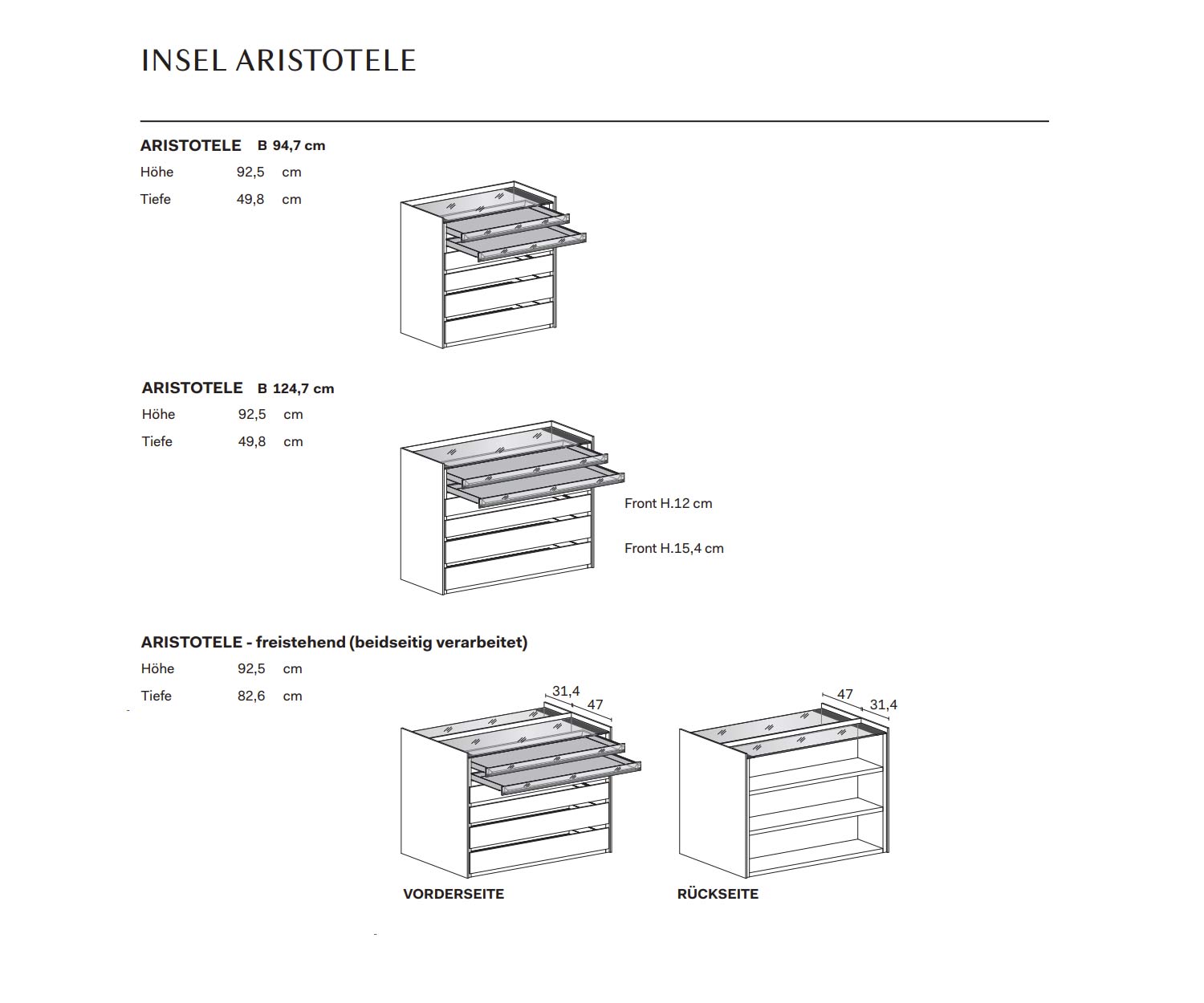 L 124,7 cm / H 92,5 cm / P 82,6 cm: version indépendante avec finition des deux côtés pour un accès de part et d'autre de l'îlot central, équipement face avant avec 6 tiroirs / face arrière avec 3 étagères .
