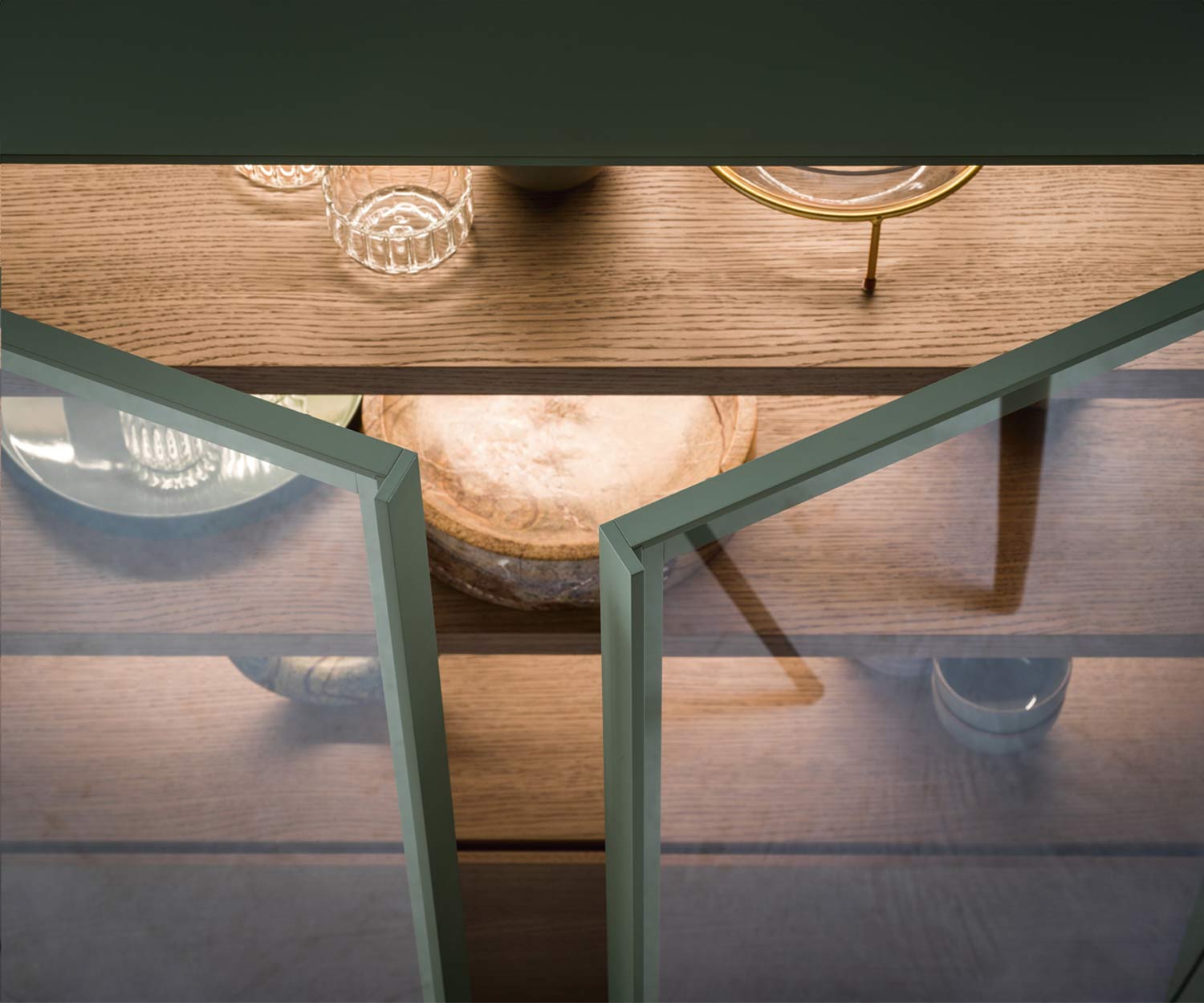 L'équipement intérieur de la vitrine en verre peut être commandé sur demande en laquage de couleur mat ou en un autre placage bois.