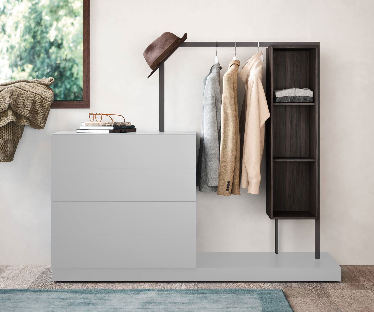 La commode design Easy 4 avec portemanteau Novamobili est disponible en 6 couleurs mates différentes pour le corps et le podium :