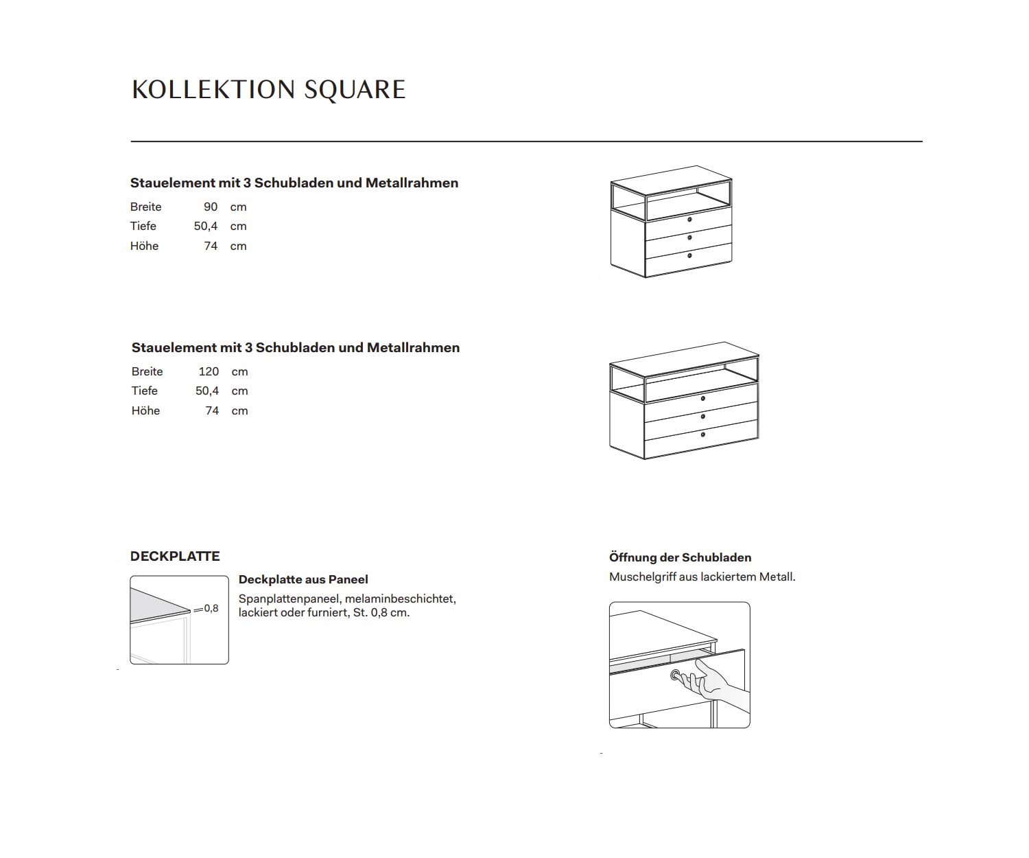 L'élégant cadre métallique qui réunit les tiroirs et les compartiments ouverts en un ensemble harmonieux est caractéristique de Square. Il en résulte un jeu captivant de structure, de légèreté et de fonctionnalité - parfait pour les salons et les chambres à coucher modernes.