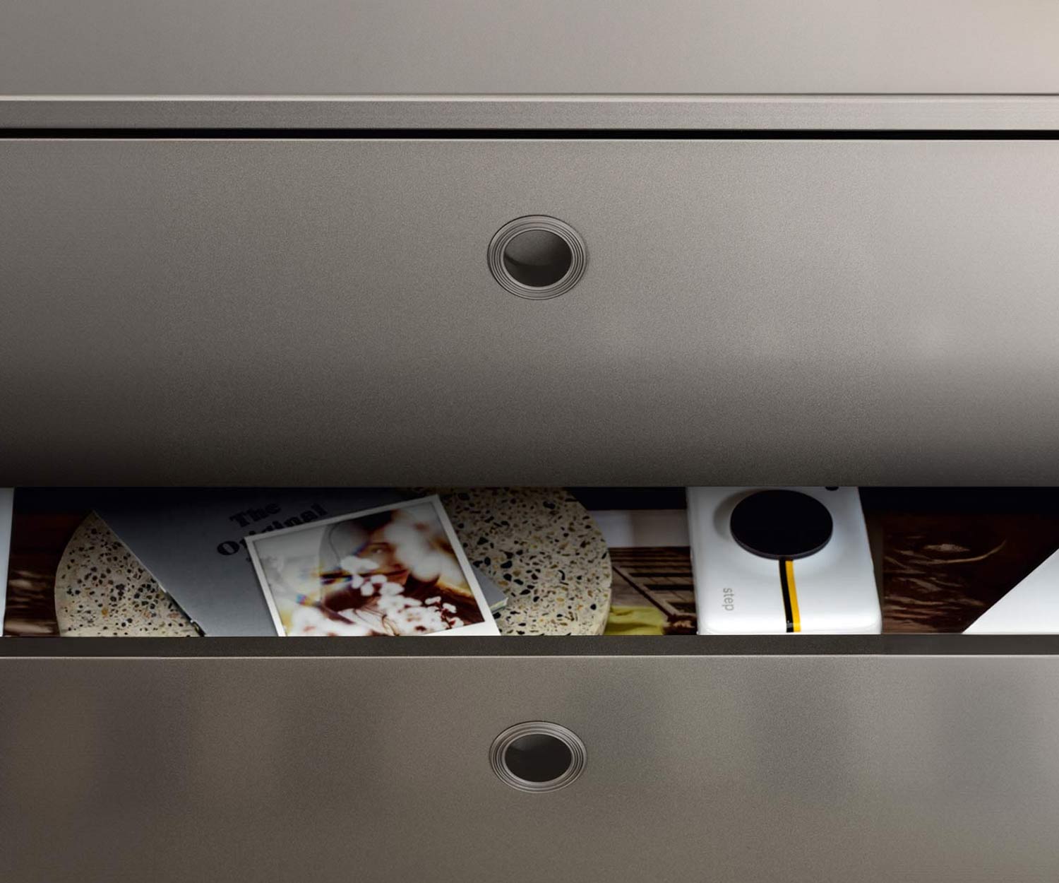 Le panneau supérieur, le panneau arrière et le panneau inférieur de l'élément de rangement ouvert ainsi que le cadre métallique de l'élément de rangement et les poignées des tiroirs sont disponibles dans la même couleur mate que le corps.