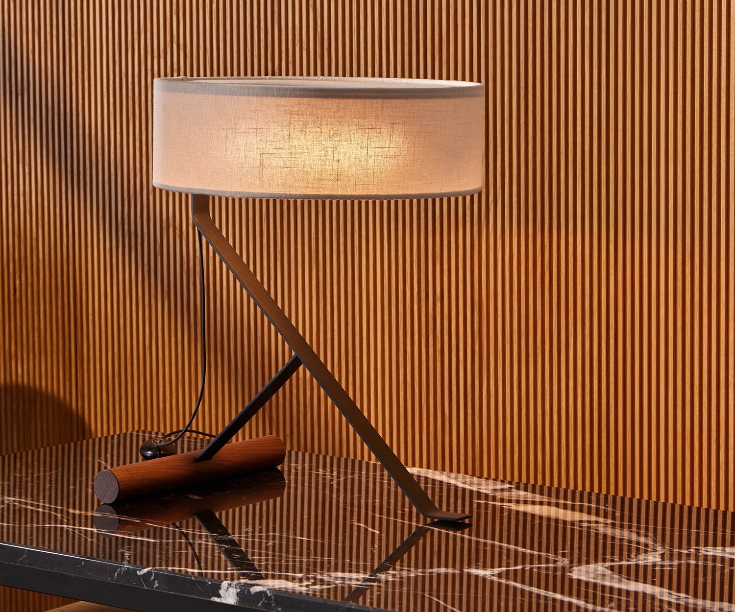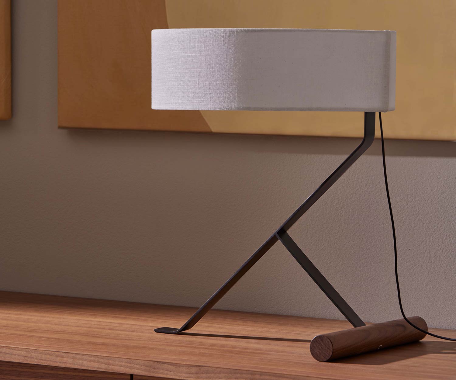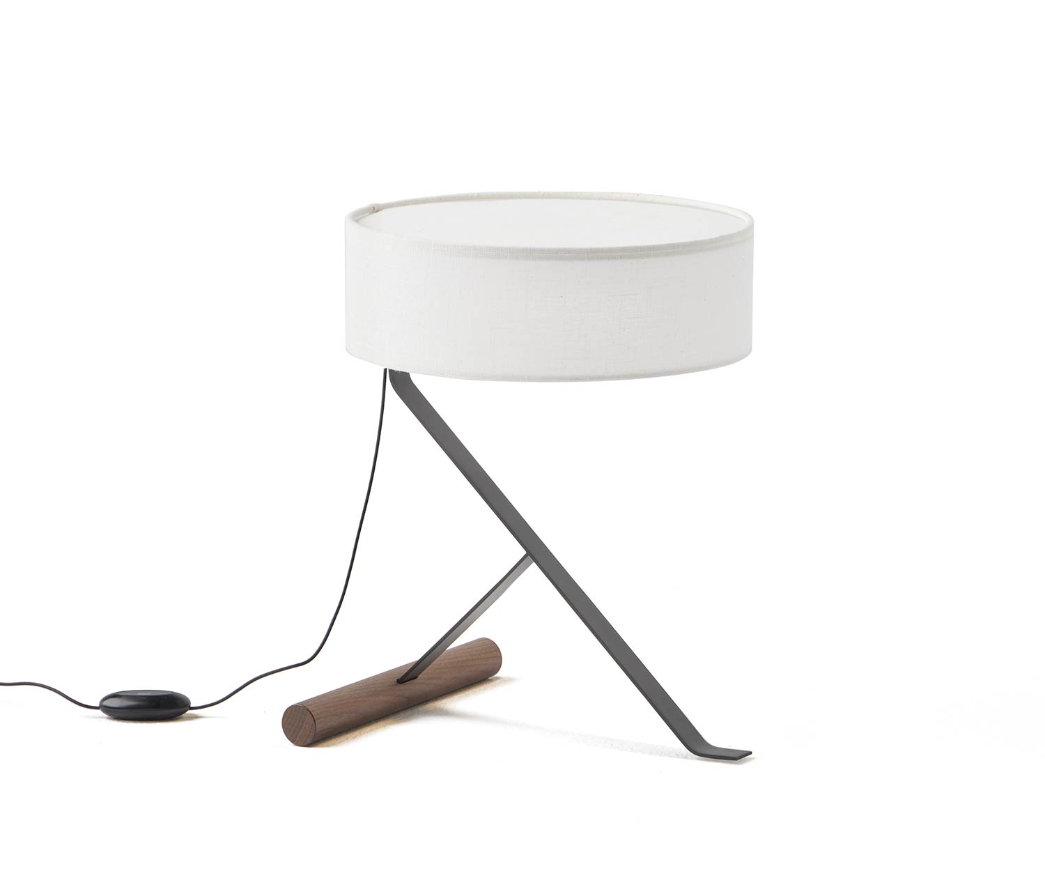 L'abat-jour de la lampe de table Punt Chicago est recouvert de coton naturel. La construction se compose de métal nickel noir et d'un pied en noyer super mat.
