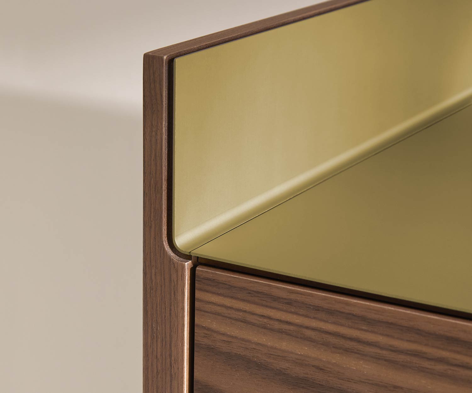 Le plateau de finition est disponible en aluminium doré, aluminium bronze et aluminium rose , le corps et la façade en chêne super mat, noyer super mat ou chêne teinté foncé (Stained Oak Ebony). Le socle en acier est disponible en noir RAL9005.