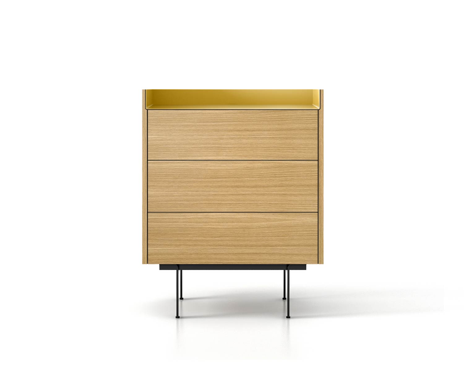 Les trois tiroirs de la commode haute design Stockholm se déplacent sur des glissières particulièrement stables et durables de Blum. Les tiroirs n'ont pas de poignées et s'ouvrent et se ferment par une légère pression sur la façade. Ils permettent une extension totale. Les pieds réglables en hauteur permettent une adaptation idéale aux sols irréguliers.