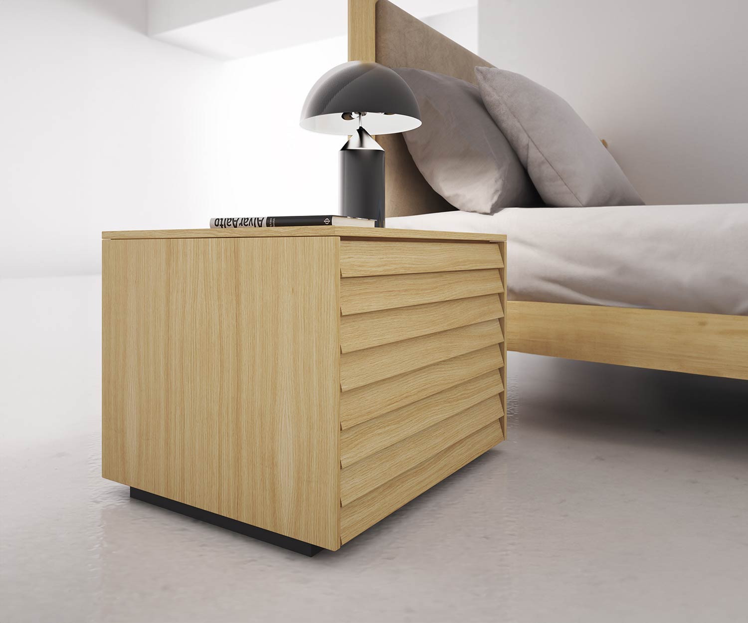 Selon les besoins, chaque version de la table de nuit Punt Sussex - 1 tiroir ou 2 tiroirs - peut être commandée avec des pieds plats de 6 cm ou de 17 cm et 29 cm de hauteur. La table de nuit design peut également être facilement suspendue à l'aide d'un kit de montage mural, pour plus d'espace de rangement et une chambre à coucher facile à entretenir. La façade à lamelles sert en même temps de poignée invisible et se fond de manière fluide dans le design. Grâce aux rails Hettich fabriqués en Allemagne, les tiroirs sont particulièrement silencieux et se ferment toujours automatiquement(technique d'amortissement Soft-Close).