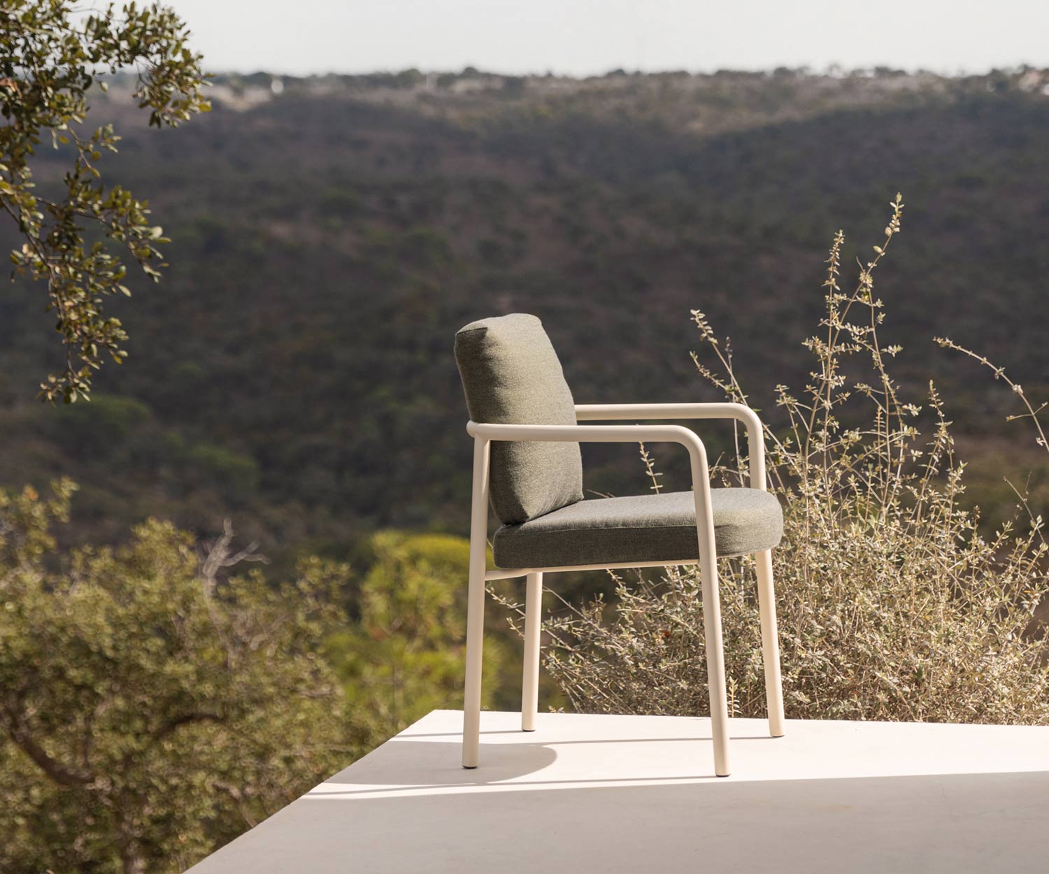 La chaise à accoudoirs Kori est livrée complète avec les coussins d'assise et de dossier, ce qui signifie que le rembourrage est inclus dans le prix. Si le rembourrage est important pour vous, veuillez le prendre à l'intérieur en cas d'intempéries extrêmes (par exemple en hiver).