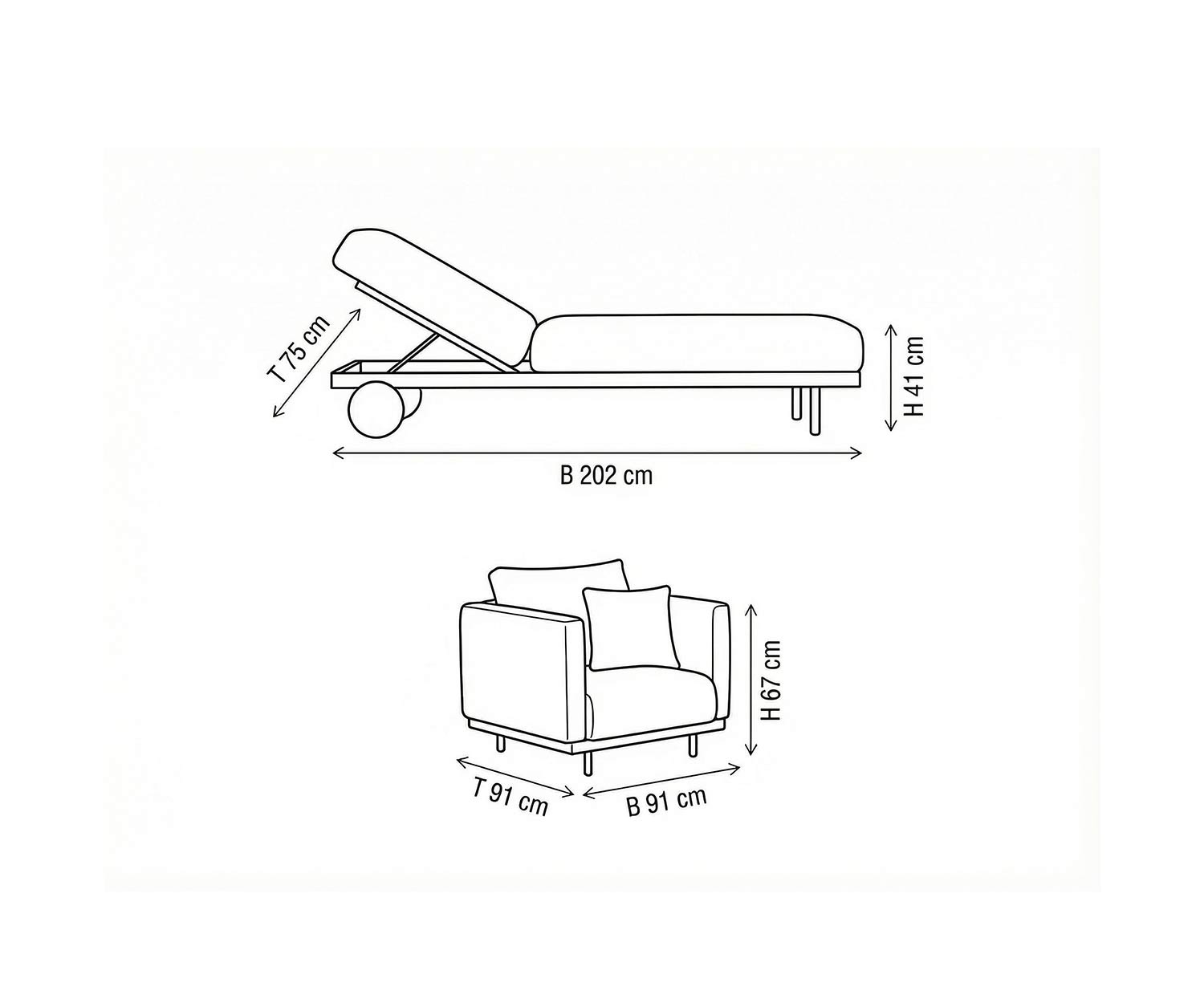 B 202 cm / H 41 cm / T 75 cm (Gartenliege)