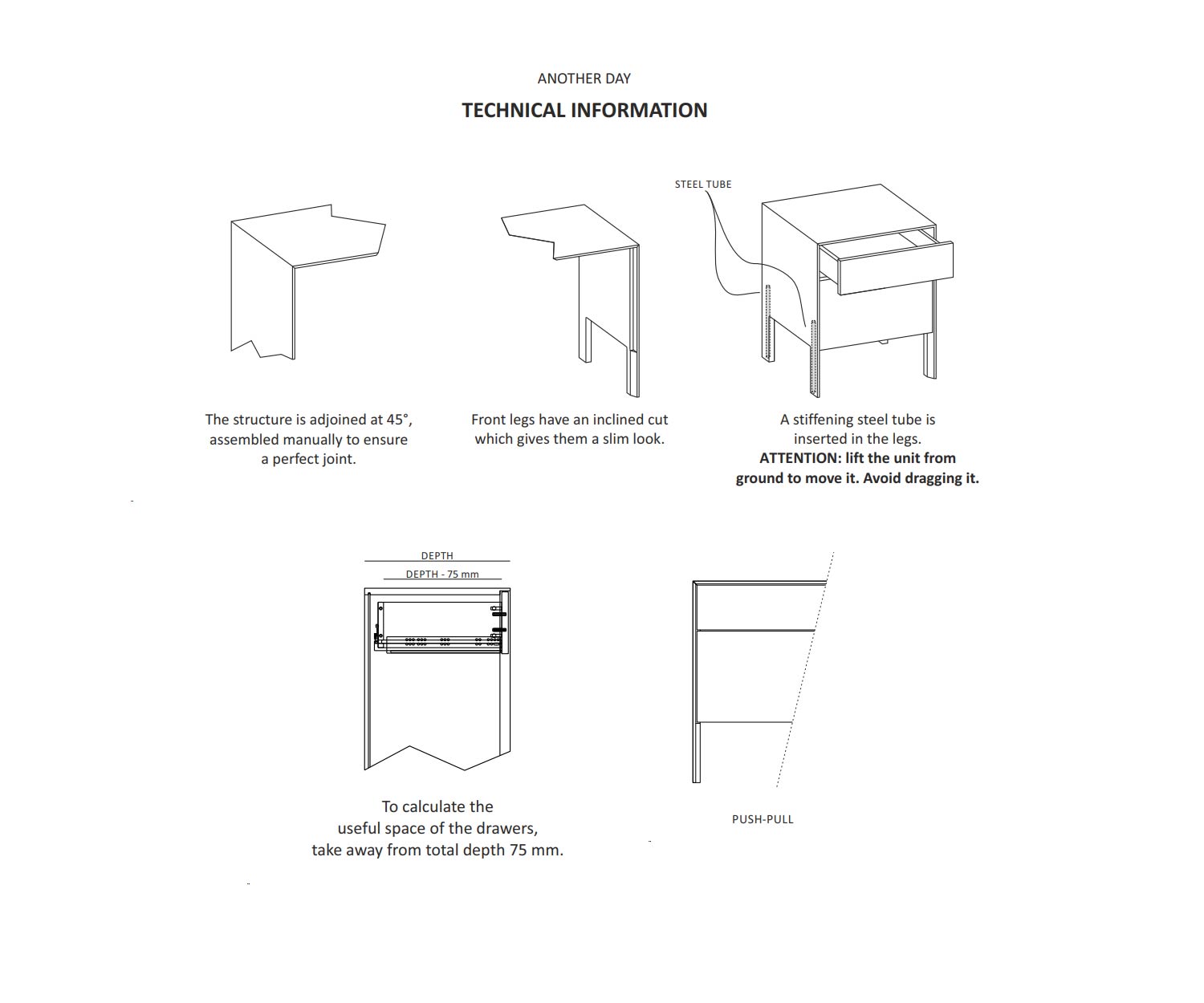 De structuur van de Another Day ladekast is in een hoek van 45 graden samengevoegd, wat niet alleen zorgt voor een esthetisch aantrekkelijke look, maar ook de stabiliteit van het meubel vergroot. Deze nauwkeurige verwerking zorgt voor een perfecte verbinding die zowel duurzaamheid als een hoogwaardig gevoel biedt.