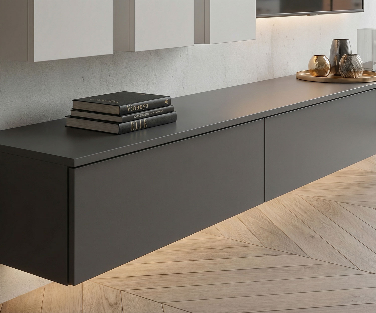 Het lowboard is verkrijgbaar in mat antracietgrijs (RAL7043). De drie bovenkasten zijn gelakt in mat wit (RAL9016) en maken indruk met hun fluweelachtige oppervlak.