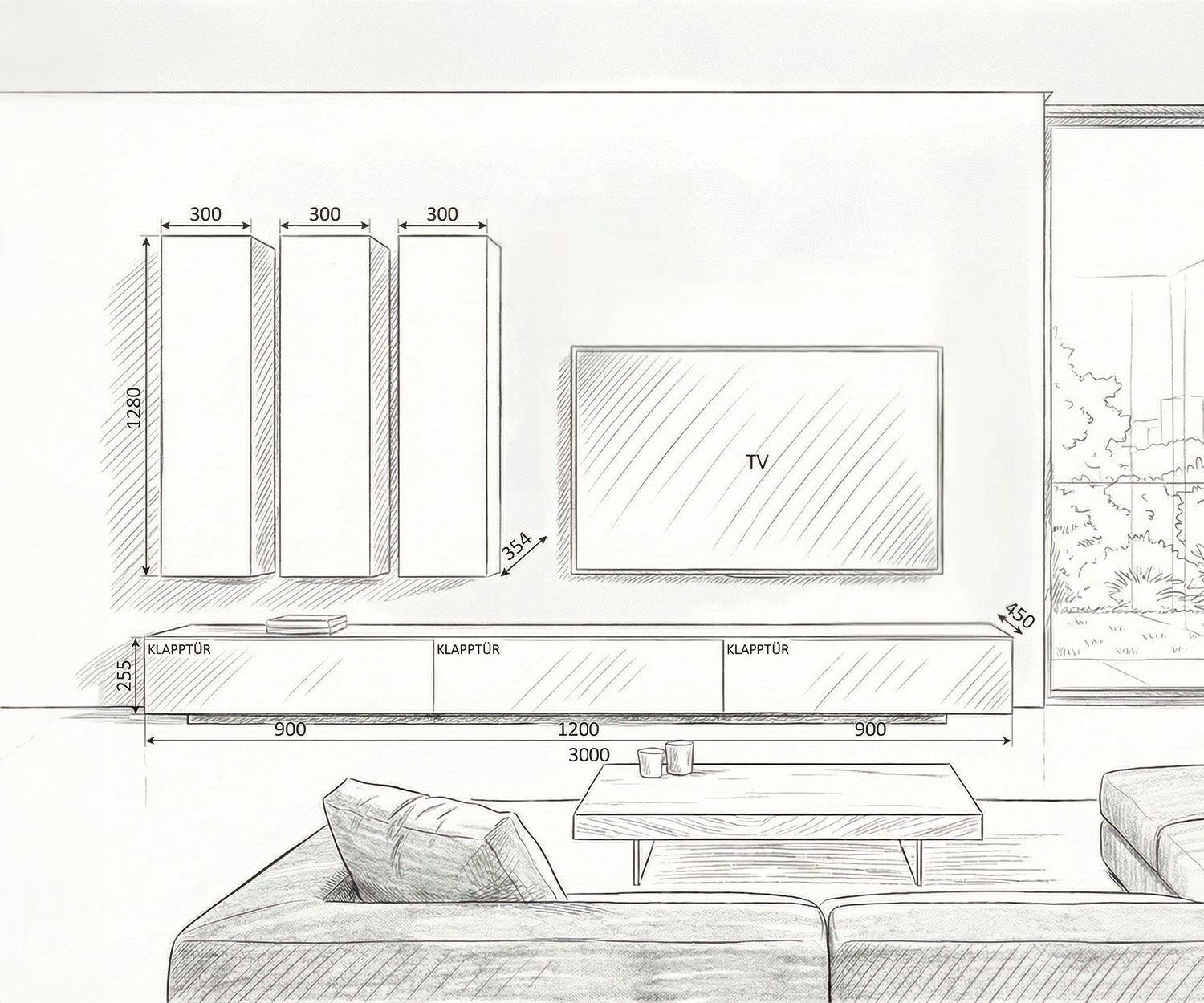 Je nieuwe droomwandkast kan worden aangepast aan je individuele ruimtelijke eisen. Om je de perfecte woonkamerinrichting te garanderen, maken we graag een op maat gemaakte 3D-visualisatie voor je.