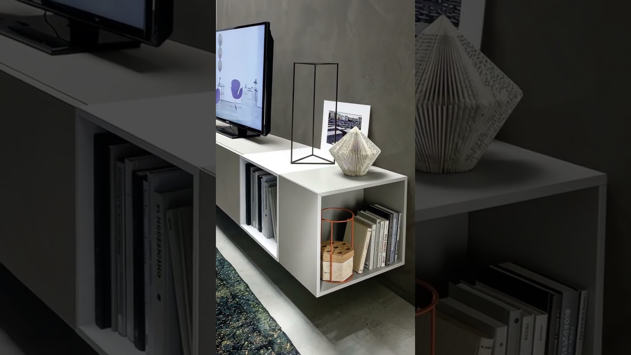 Modern Livitalia design wandmeubel C07 uit Italië. Bestaande uit een 390 cm breed lowboard met open elementen voor boeken en decoraties en een groot gesloten wandmeubel met veel opbergruimte voor boeken, glazen of dvd's. Maatwerk is mogelijk op aanvraag. Lowboard met klapdeur voor elektronische apparaten in het onderste gedeelte. Met kabelgeleiders voor beter kabelbeheer op aanvraag.
