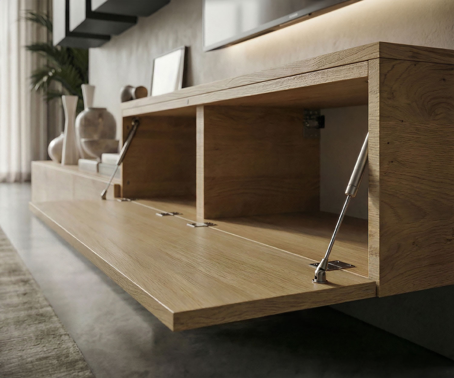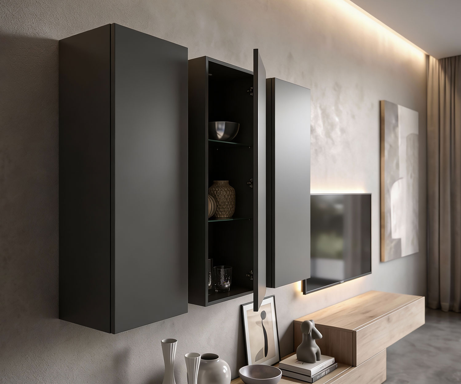 Het lowboard is gefineerd in licht eiken. Het echte houtfineer heeft een voelbare nerf en echte knoesten. De bovenkasten zijn volledig gelakt in antraciet (RAL7043) mat en maken indruk met hun fluweelachtige oppervlak.
