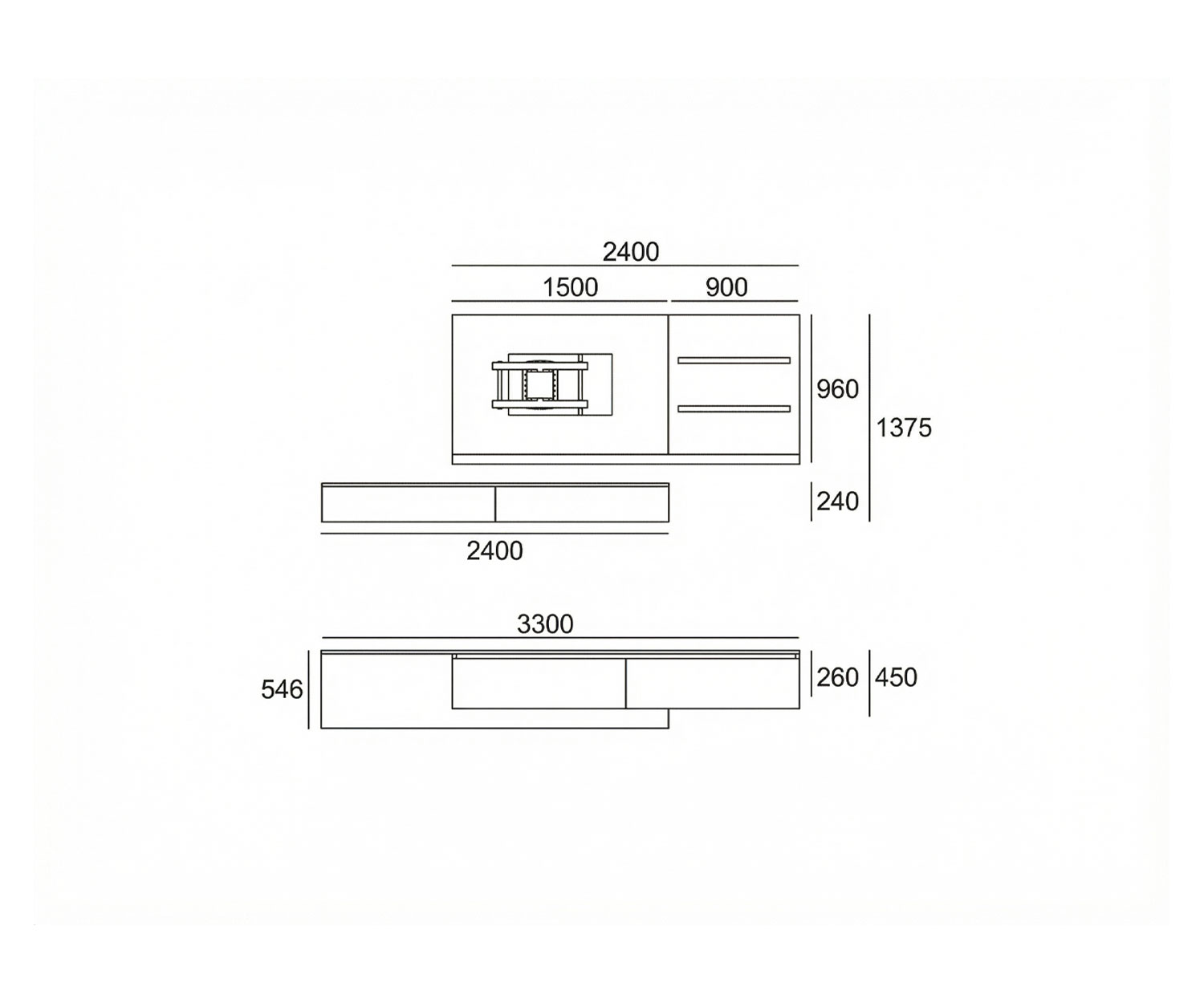 B 330 cm / H 137,5 cm / D 25/45/54,6 cm