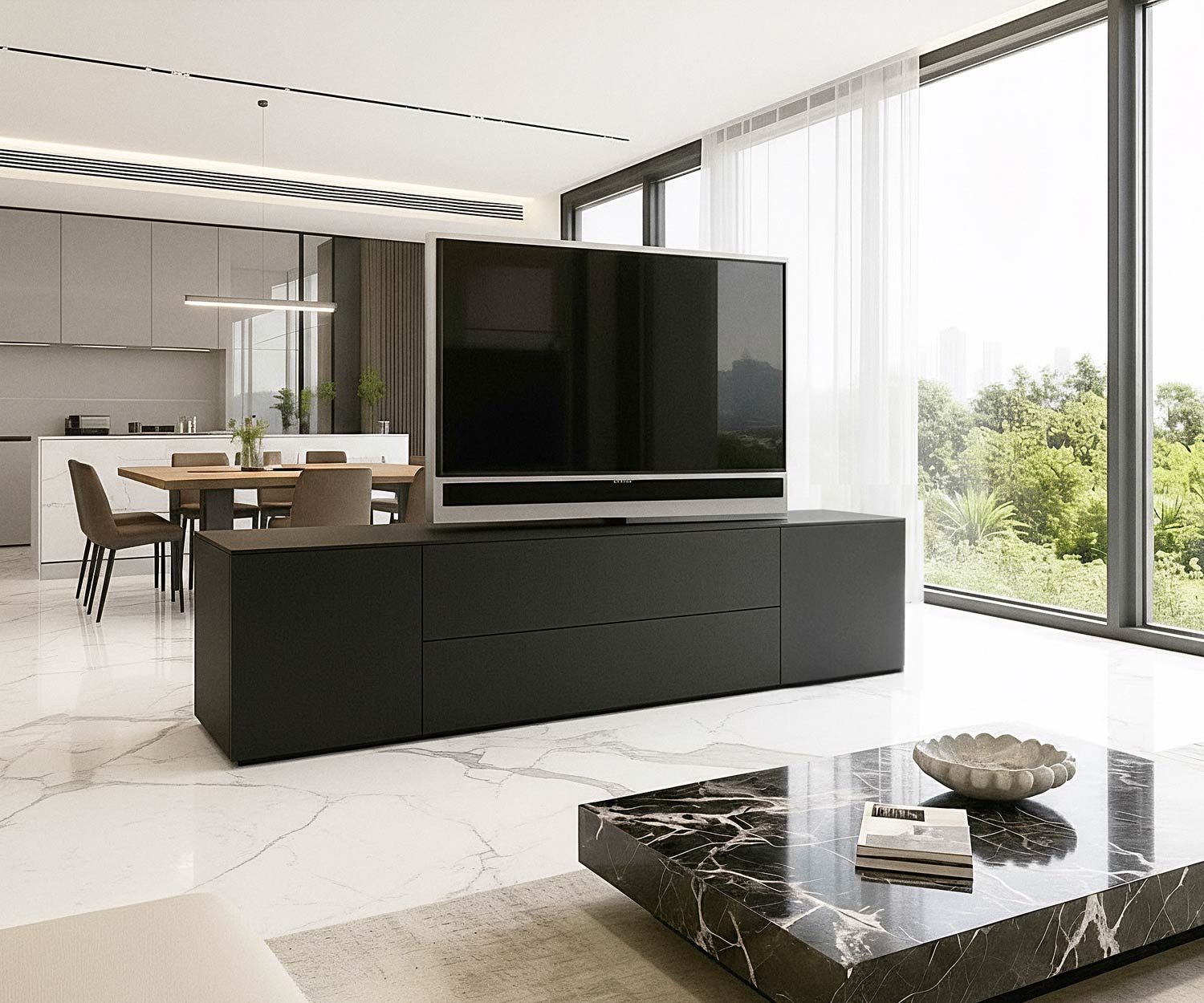 Das drehbare TV-Paneel hat unser Wohnzimmer in einen flexiblen Raum verwandelt, der jetzt viel lebendiger wirkt.
