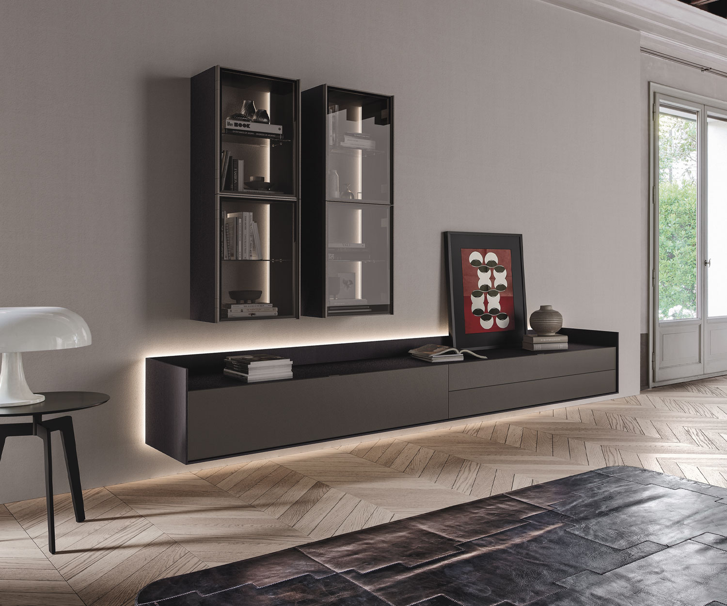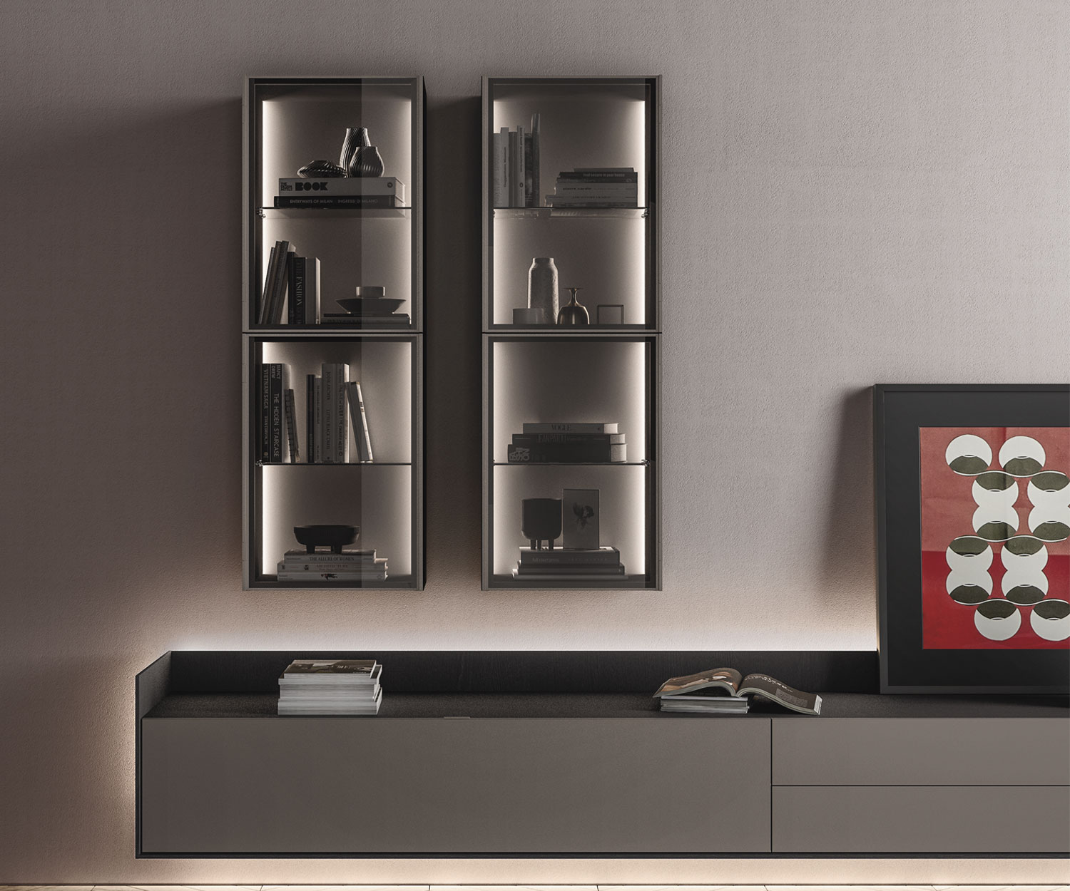De moderne hangende Livitalia Design vitrinekast Scrigno wordt alleen voor jou op bestelling gemaakt in Italië. De vitrinekast heeft grote glazen deuren met een smal frame. De vitrinekast is verkrijgbaar in verschillende modulebreedtes (zie schets), die gecombineerd kunnen worden tot een variant van elke breedte (zoals afgebeeld). Een doorlopend afdekpaneel kan worden gebruikt tot een breedte van 300 cm. 180° scharnieren op de deuren zorgen voor gemakkelijke toegang tot het interieur.