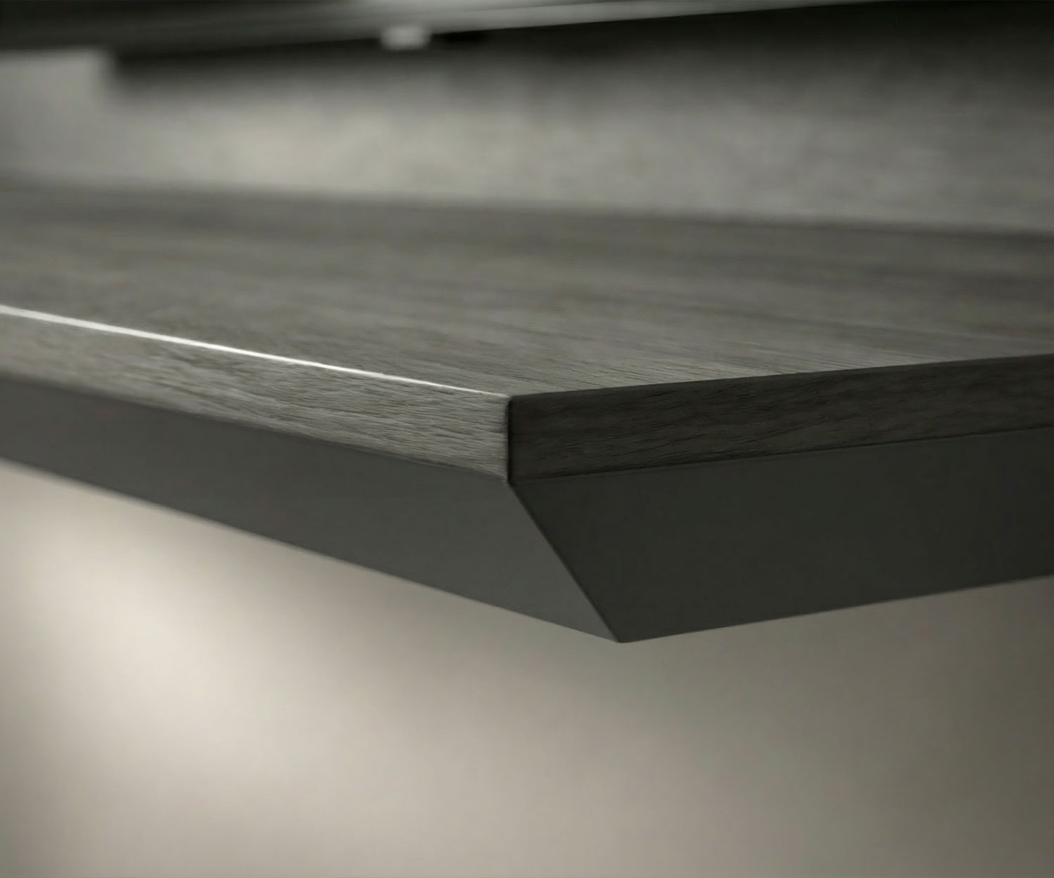 De zichtbare oppervlakken van de achterwand en de bank zijn bekleed met hoogwaardig, gelakt houtfineer in edel Eiken Carbon Zwart. De randen en niet-zichtbare oppervlakken zijn polyester gecoat en vervolgens mat Donkergrijs gelakt.