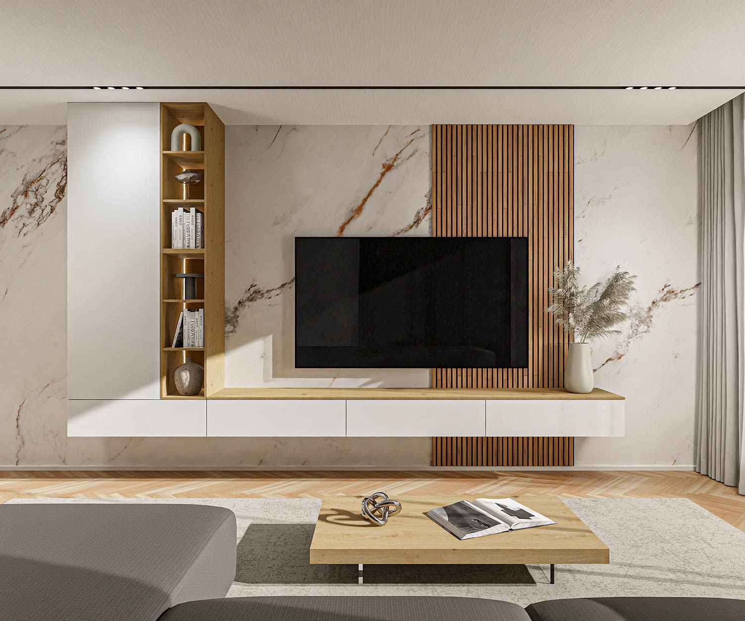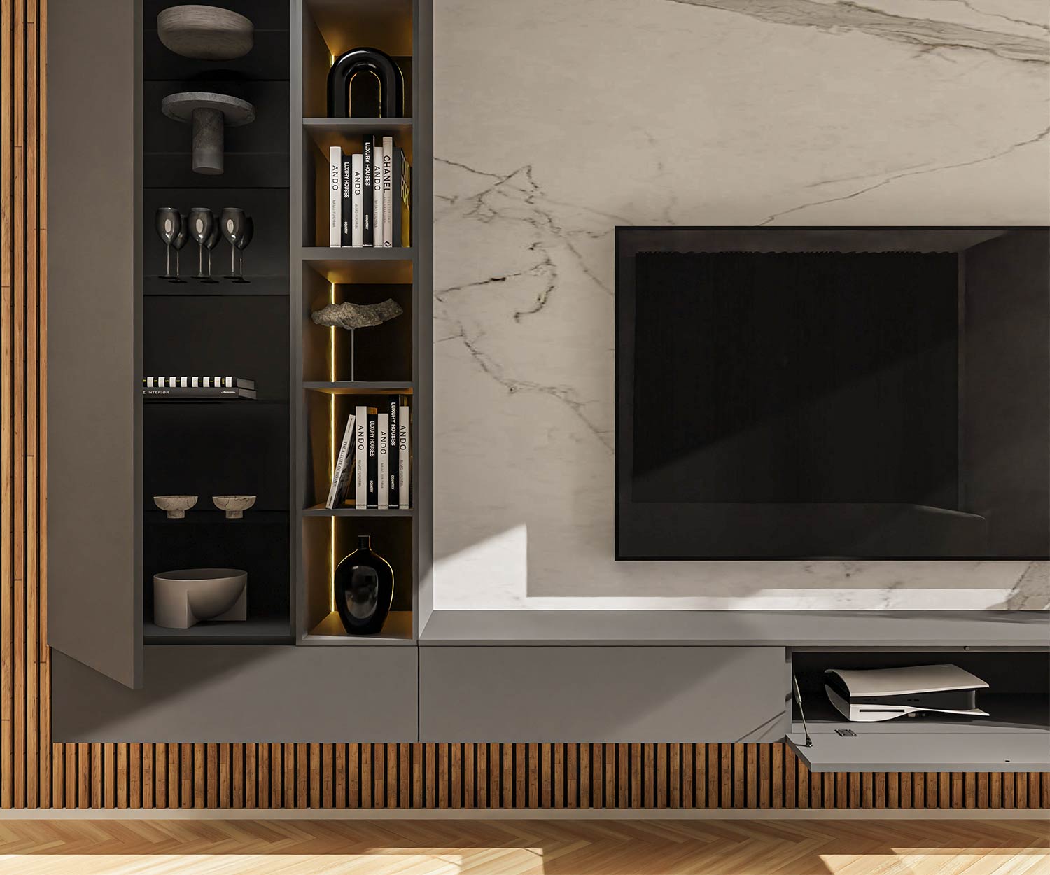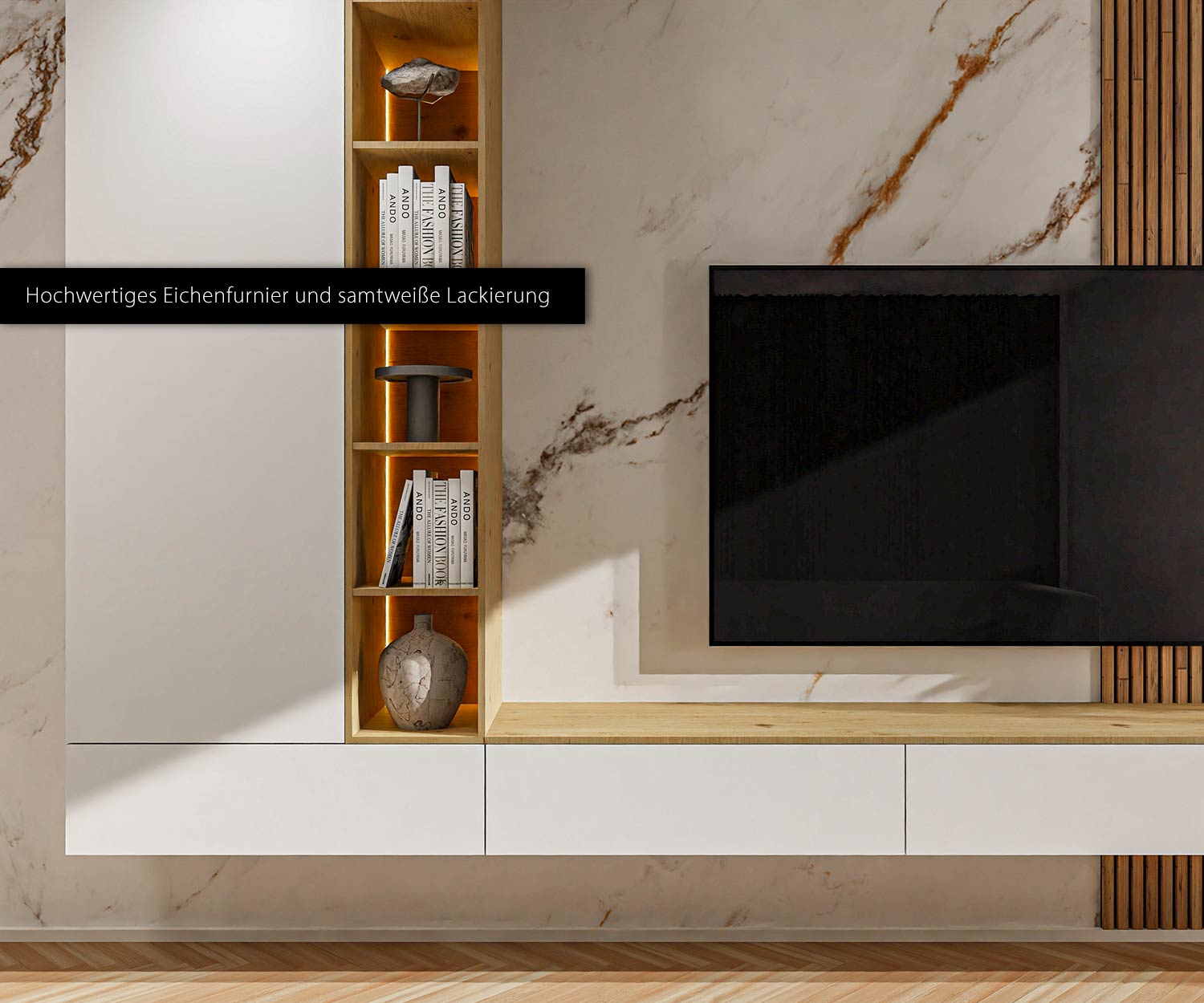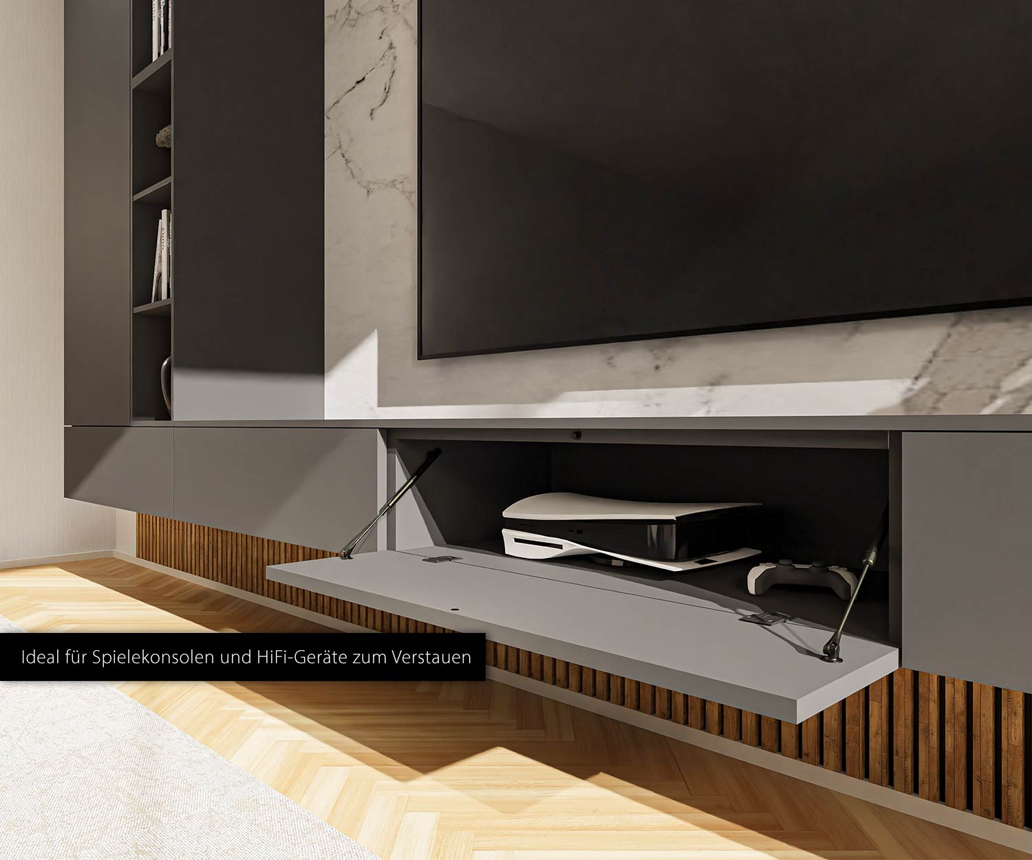 Het lowboard biedt vier afzonderlijk te openen vakken met soft-close met soft-close beslag en een push-to-open mechanisme; de elektronica is verborgen achter erachter verborgen, beschermd tegen stof en geventileerd. In de hoge kast zijn in hoogte verstelbare In de hoge kast kunnen de in hoogte verstelbare legplanken vrij worden geplaatst; het open rek zet accenten met zijn 3000 K LED strip accentueert en benadrukt geselecteerde stukken.
