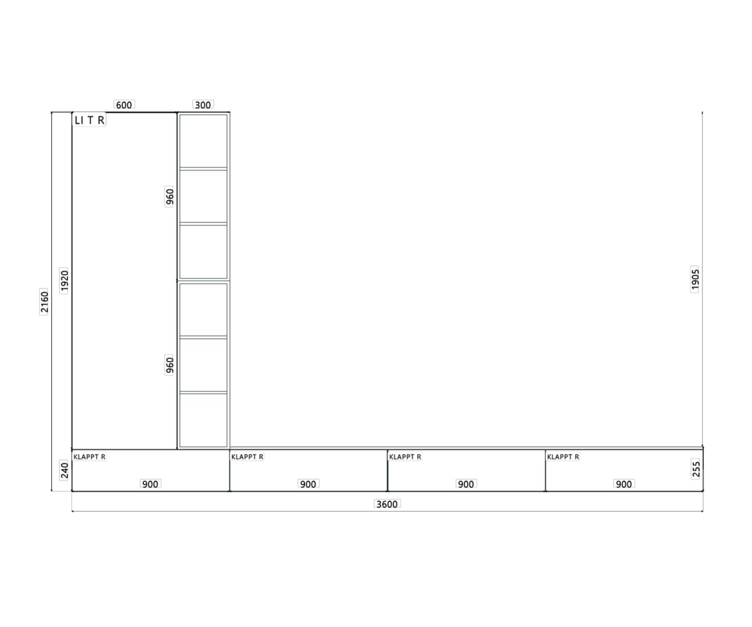 Het lowboard is 360 cm breed, 25,5 cm hoog en ongeveer 45 cm diep. en ongeveer 45 cm diep; de onderrand is 24 cm boven de vloer. vloer. De hoge kast is 60 cm breed, 216 cm hoog en ligt gelijk met de vloer. diepte. De open kast ernaast is 30 cm breed, ook 216 cm hoog en verdeeld in vier vakken. hoog en verdeeld in vier vakken; elk dubbel segment heeft een vrije hoogte van 96 cm. hoogte van 96 cm. De totale breedte van de combinatie blijft 360 cm, de totale hoogte De totale hoogte van de onderkant van het lowboard tot de bovenkant van de voorraadkast is 240 cm.