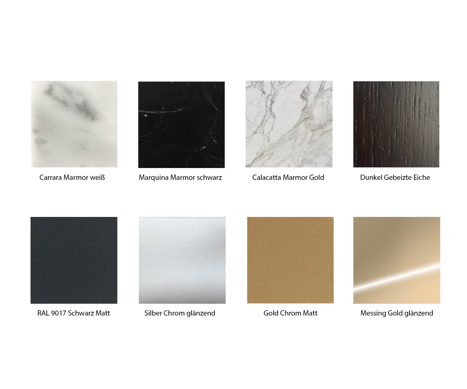 Het tafelblad is verkrijgbaar in donker eiken en het marmer in Carrara White, Marquinia Black, Emperador Brown, Calacatta Gold of Black & Gold. De poten van het onderstel zijn verkrijgbaar in de kleuren zwart mat, wit mat, chroom glanzend, chroom zwart glanzend, goud mat of messing .