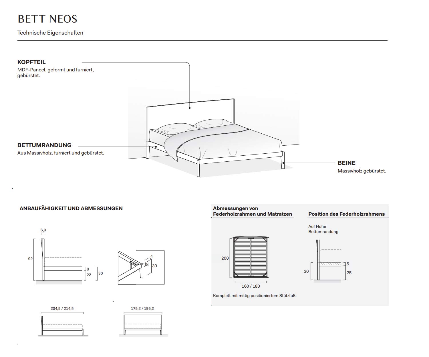 De harmonieuze combinatie van hoofdbord en bedframe creëert een rustig, helder ontwerp, terwijl de massief houten poten, die in een hoek van 45° ten opzichte van het bedframe zijn geplaatst, het meubelstuk een opmerkelijke precisie en visuele lichtheid geven.