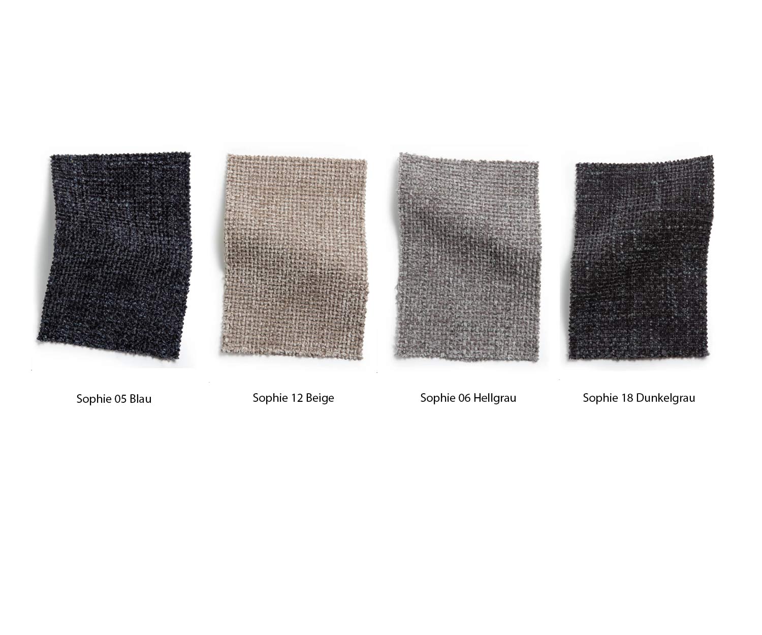 De hoogwaardige Sophie hoes is verkrijgbaar in 4 kleuren: beige, donkergrijs, lichtgrijs en blauw. Het bijzonder grove garen zorgt voor een bijzondere uitstraling. Op aanvraag zijn ook andere stoffen verkrijgbaar.