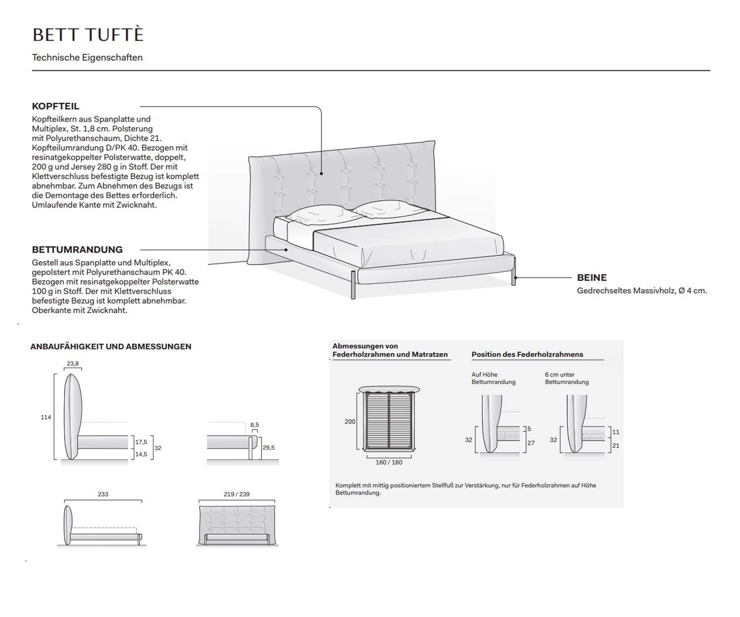 Het hoofdbord en de bedrand van het Novamobili Tufte bed zijn gemaakt van multiplex (vijf lagen fineer op elkaar gelijmd) en spaanplaat en bevatten een vulling van polyurethaanschuim. De rand van het hoofdbord is bekleed met een met resinaat beklede wattering.