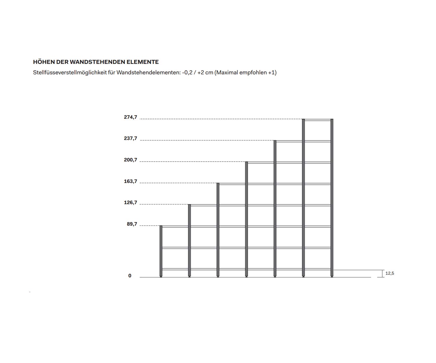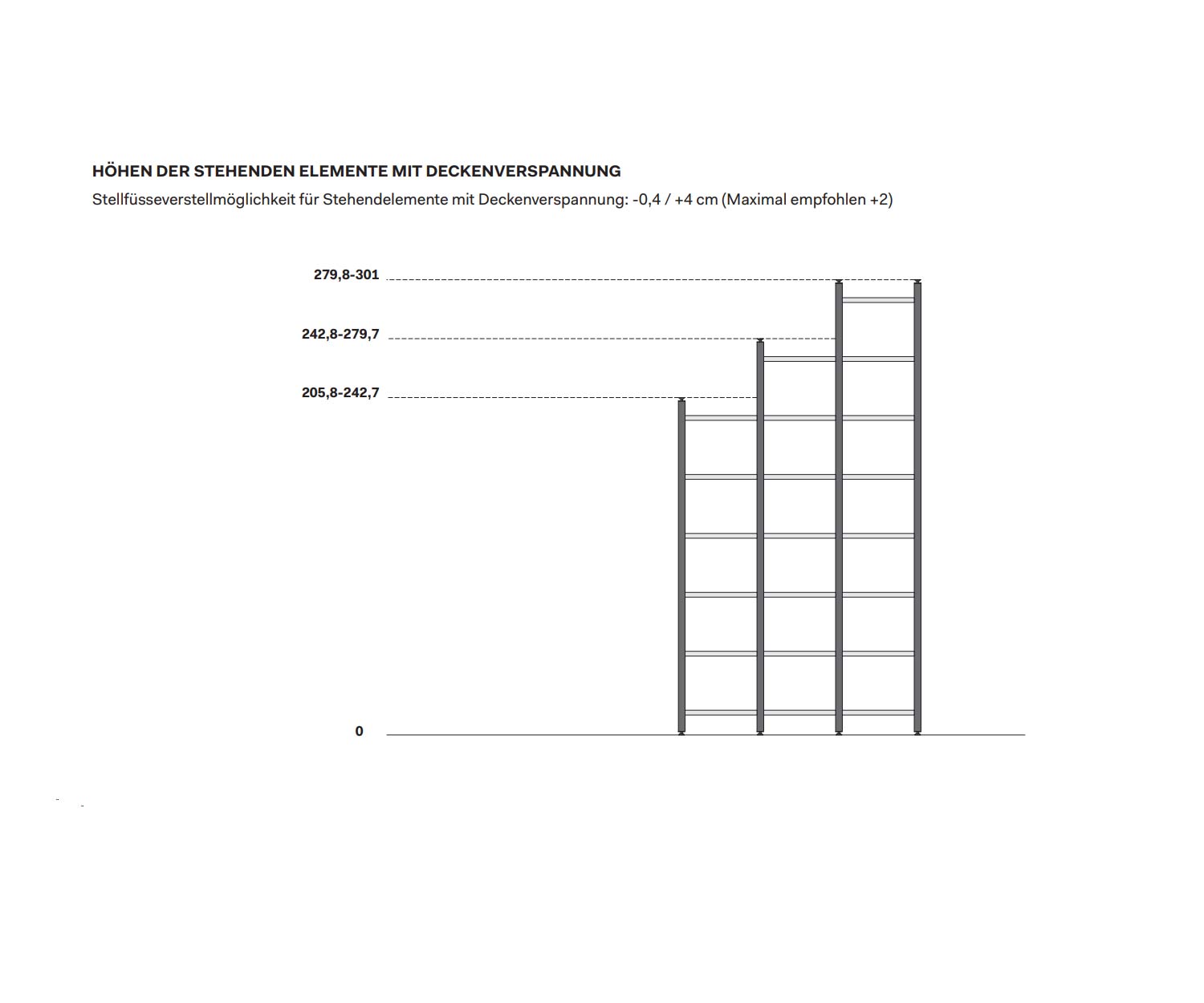 De volgende hoogtes zijn mogelijk: 93,7 - 132,7 - 171,7 - 210,7 - 249,7 - 288,7 cm