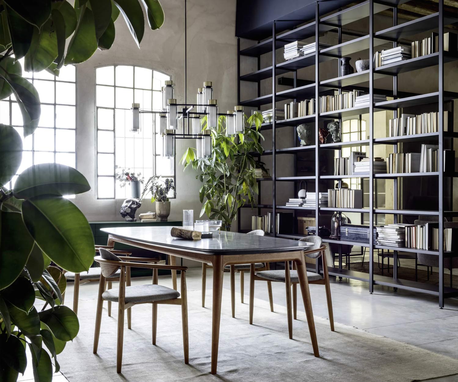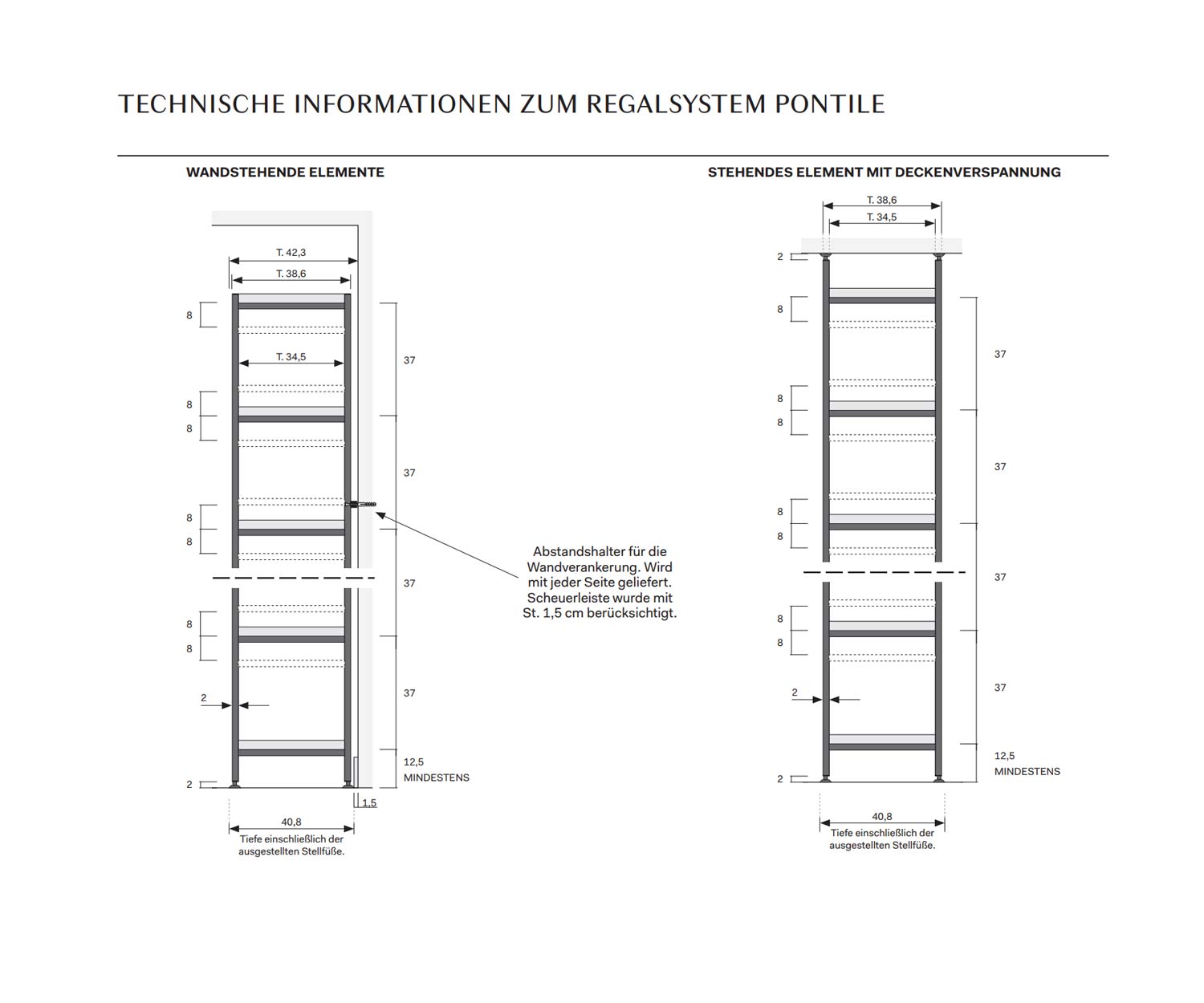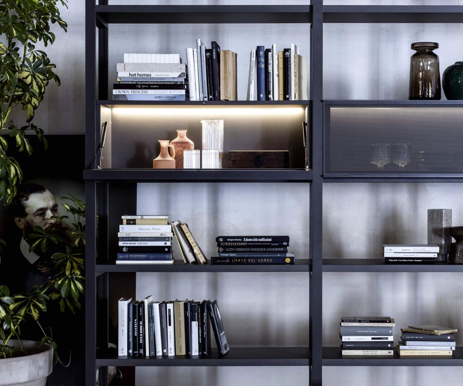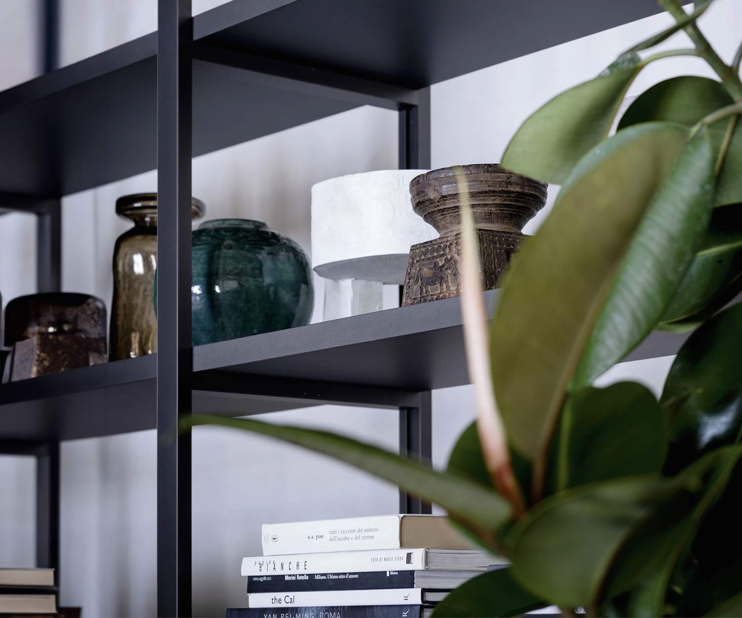 Modern Pontile metalen rekkensysteem. Het rekkensysteem wordt uitsluitend op bestelling gemaakt via Novamobili in Italië. Op verzoek kunnen we de gewenste plankafmetingen configureren.