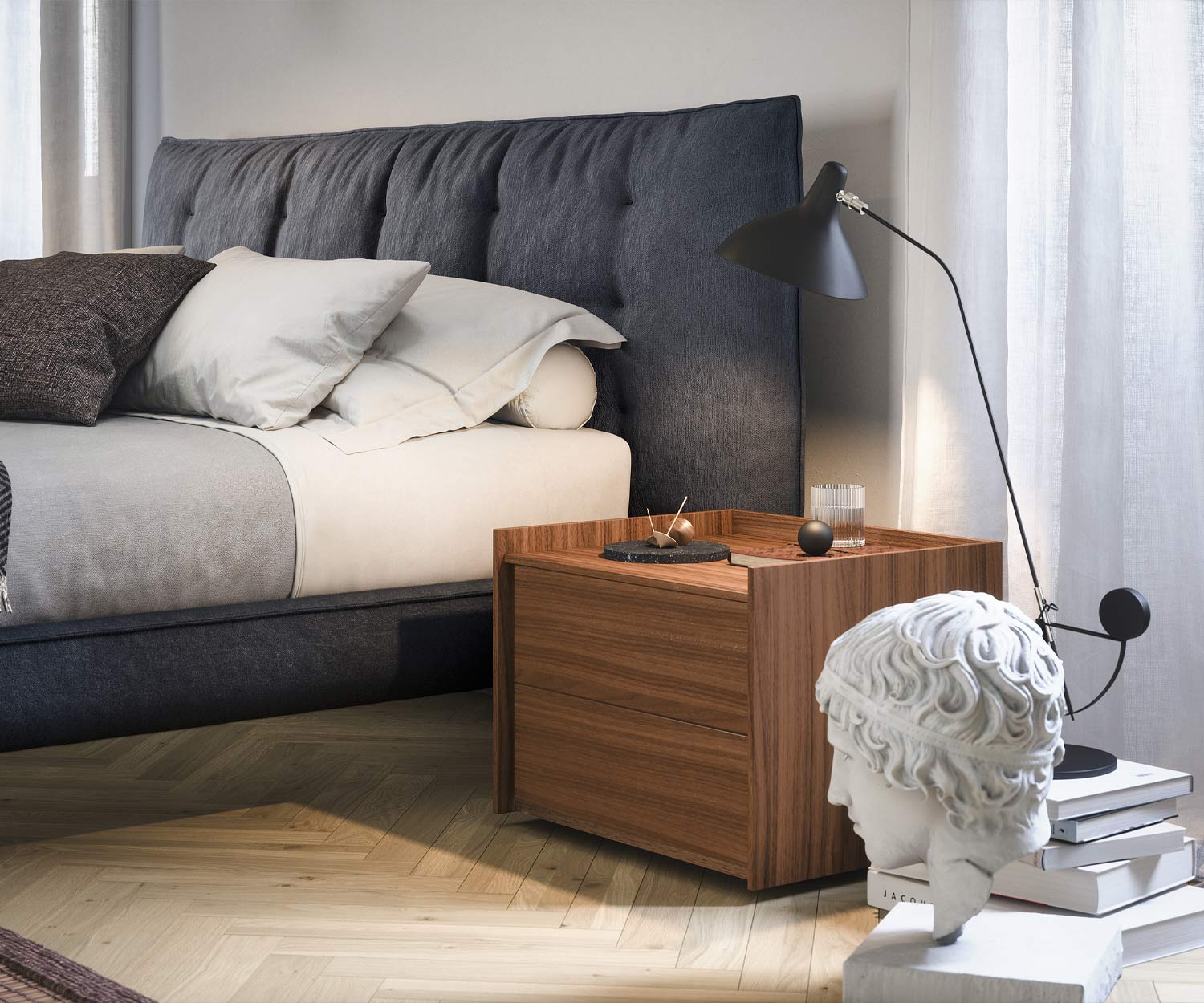 Het nachtkastje Sly wordt op de foto's hierboven getoond in de kleur Walnut Noce Canaletto N03 houtfineer.