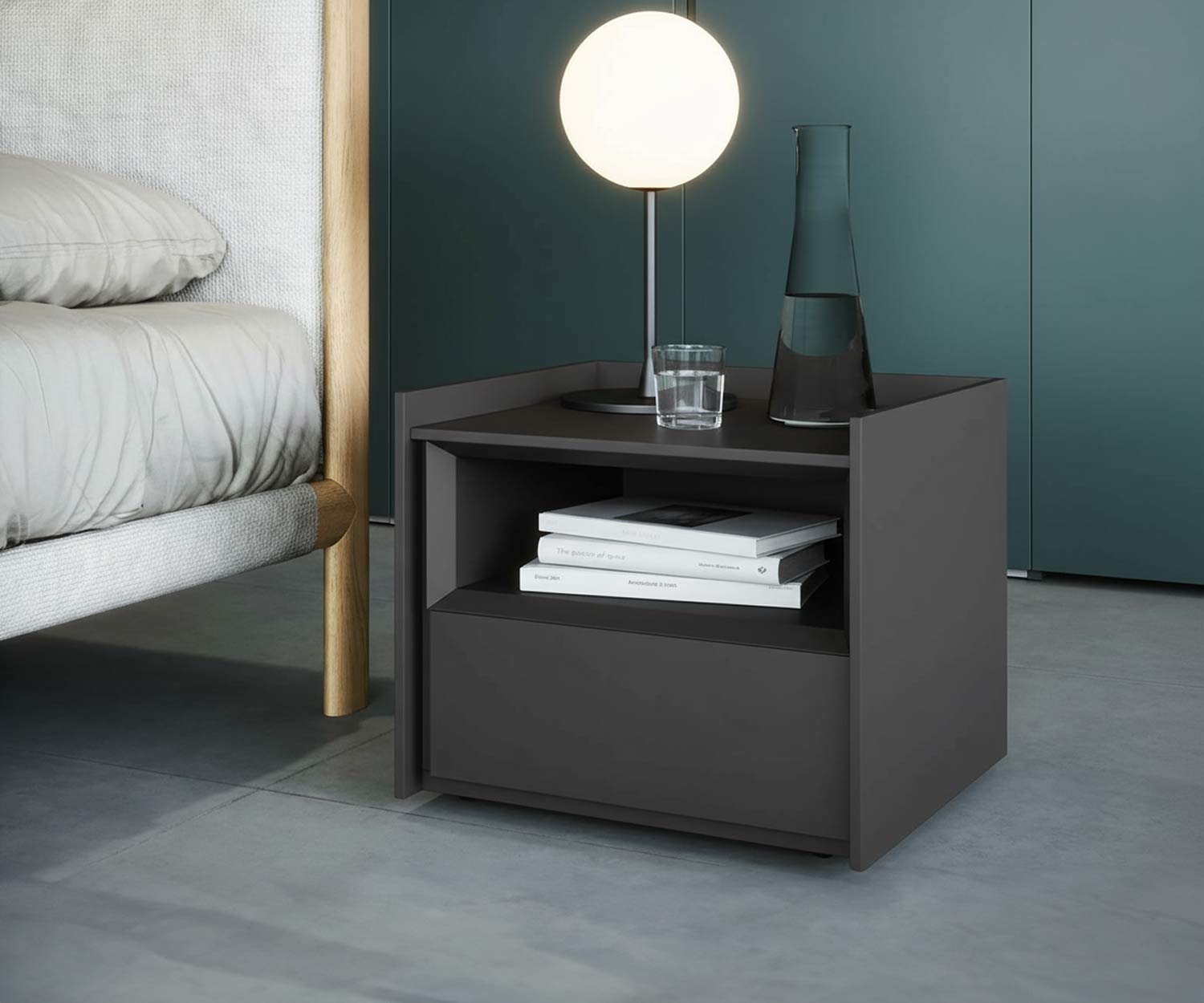 Het nachtkastje is verkrijgbaar in 5 moderne matte kleuren en 2 houtfineren. Matzwart (zoals RAL9017), wit (zoals RAL9016), lichtgrijs (zoals RAL7035), donkergrijs (zoals RAL7022) of beige (zoals RAL1019). Ook verkrijgbaar in eiken Rovere Chiaro N04 of walnoot Noce Canaletto N04.