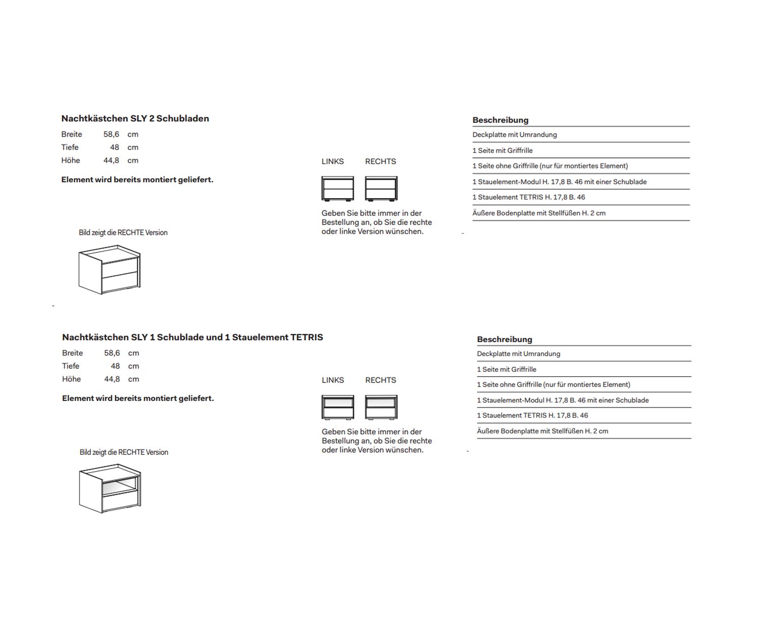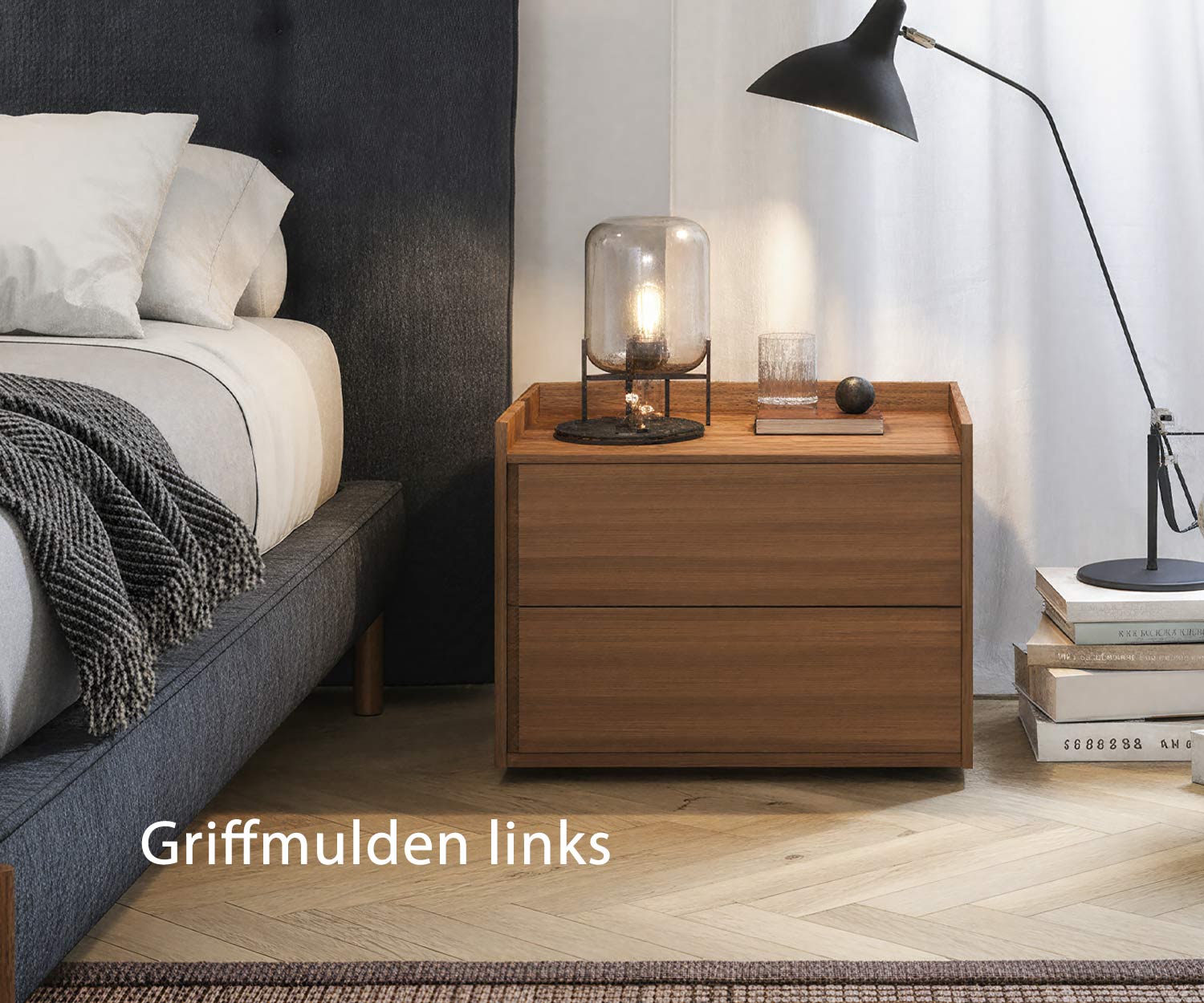 De laden van het nachtkastje Sly hebben hoogwaardige glijrails met automatische sluiting (soft-close technologie). De laden worden geopend met verzonken handgrepen. Je kunt het ontwerp van de verzonken handgrepen voor de bijpassende bedzijde selecteren in de configurator.