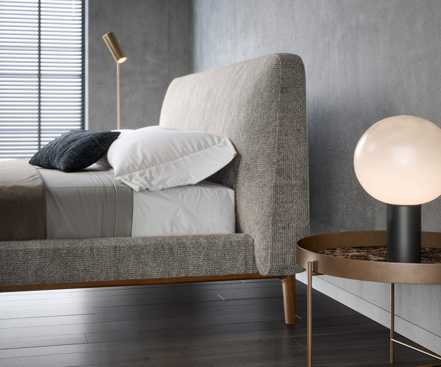 De houten poten en de bedbodem aan de zijkant zijn verkrijgbaar in walnoot (N03 Noce Canaletto) of zwart gebeitst essenhout (N05 Rovere Carbone).