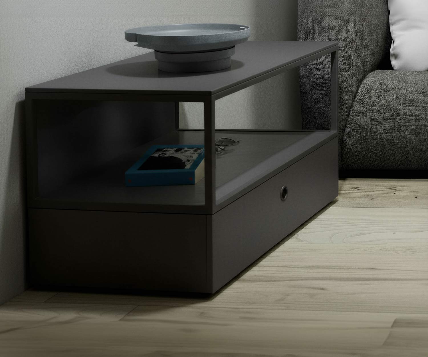 . Het afdekpaneel, het achterpaneel en het bodempaneel van het open opbergelement, evenals het metalen frame van het opbergelement en de handgrepen van de lades zijn verkrijgbaar in dezelfde matte kleur als de romp.