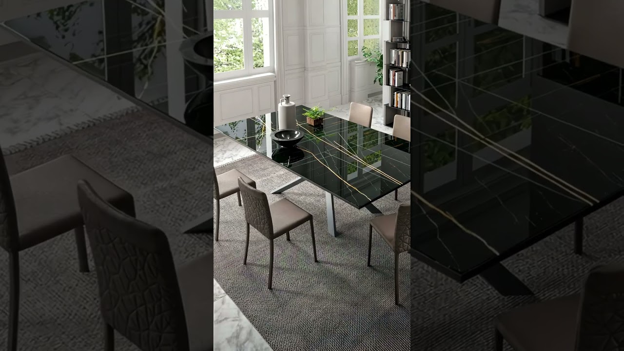 Het massieve frame van de 4x4 tafel heeft altijd een subtiele en elegante grafietgrijze kleur. Het elegante tafelblad daarentegen kan worden gekozen in een moderne houtkleur of een marmeren glaskleur.