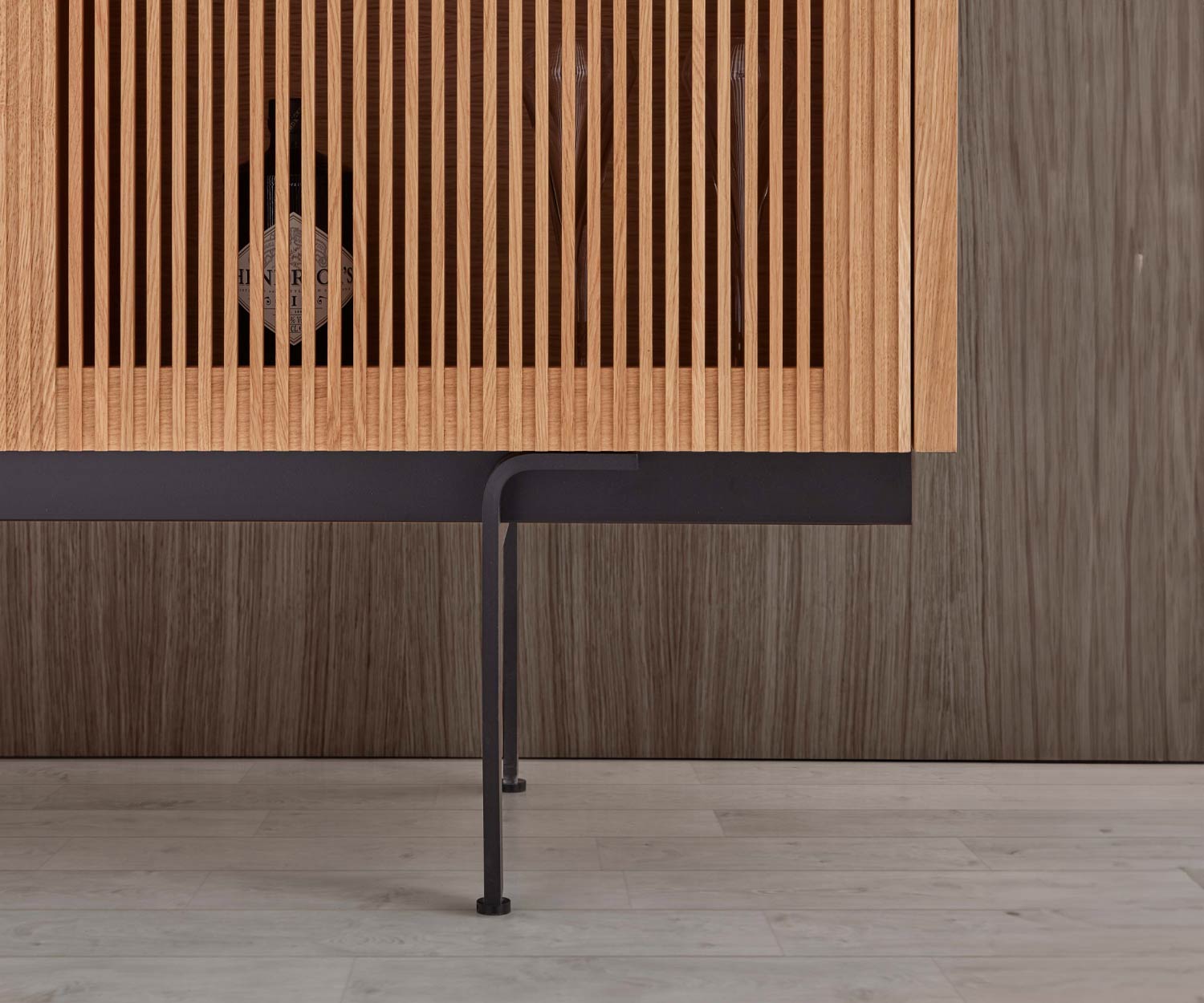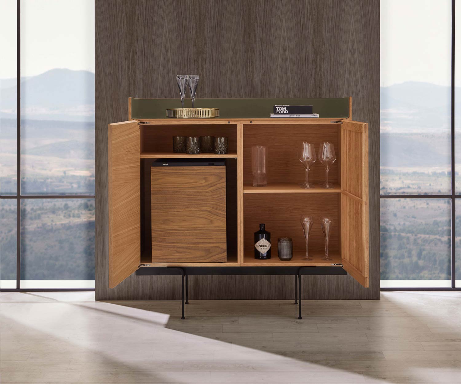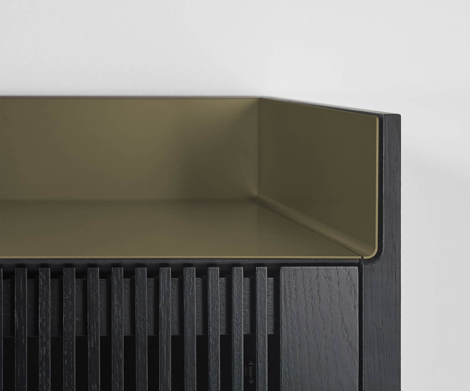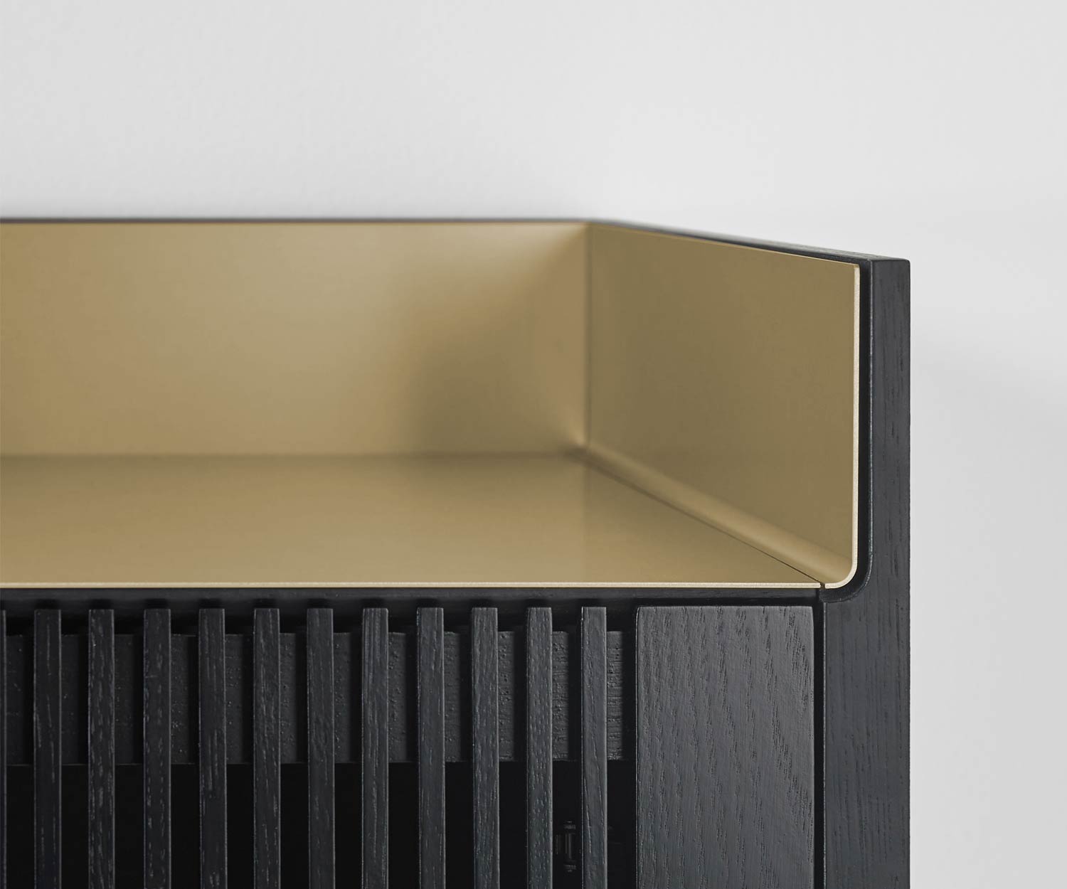 De afdekplaat is verkrijgbaar in de kleuren aluminium goud, aluminium brons en aluminium rosé . De romp en het front zijn verkrijgbaar in super mat eiken, super mat walnoot of donker gebeitst eiken (gebeitst eiken ebbenhout). De poten zijn verkrijgbaar in de kleur zwart RAL9005.