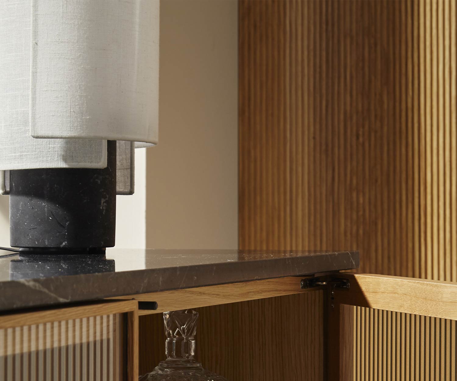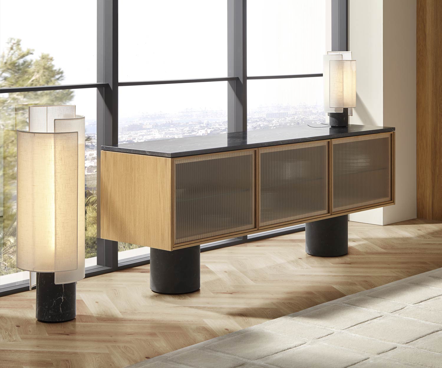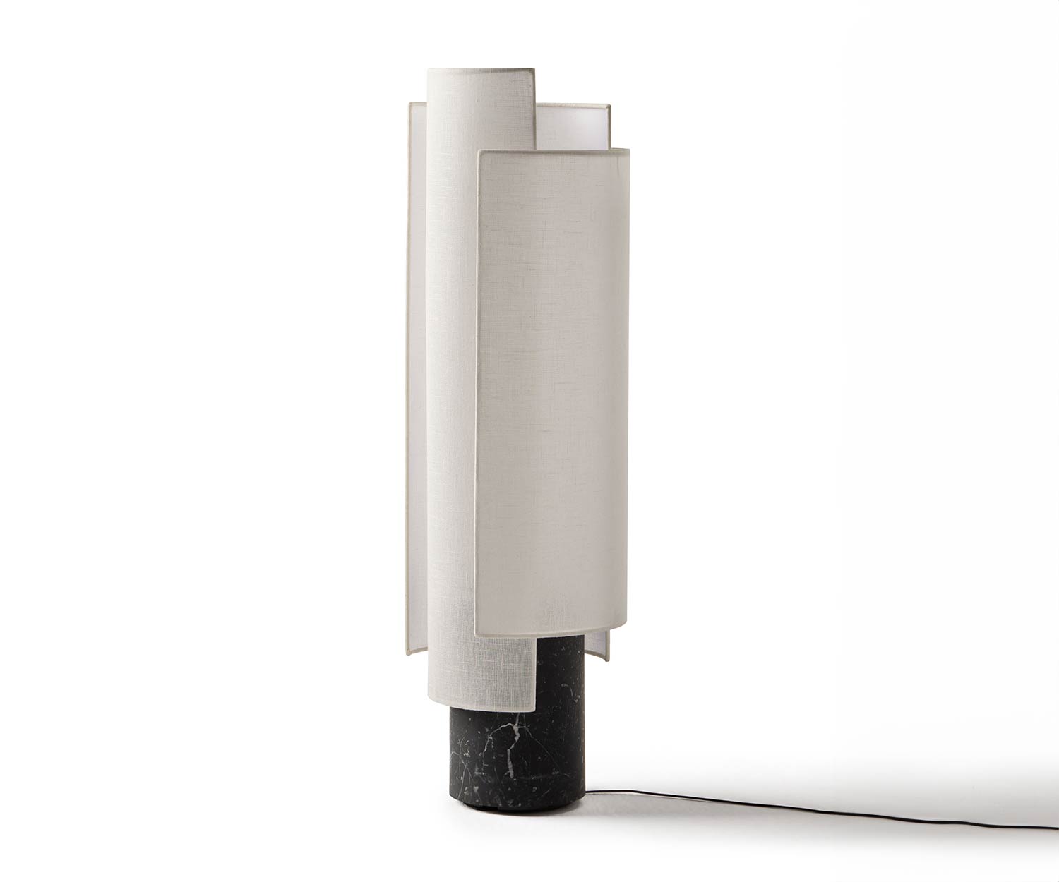 Materiaal: De lampenkap bestaat uit cilinders met een goudkleurig aluminium frame, bedekt metnatuurlijk katoen. De sokkel is verkrijgbaar in massief zwart Marquina marmer .