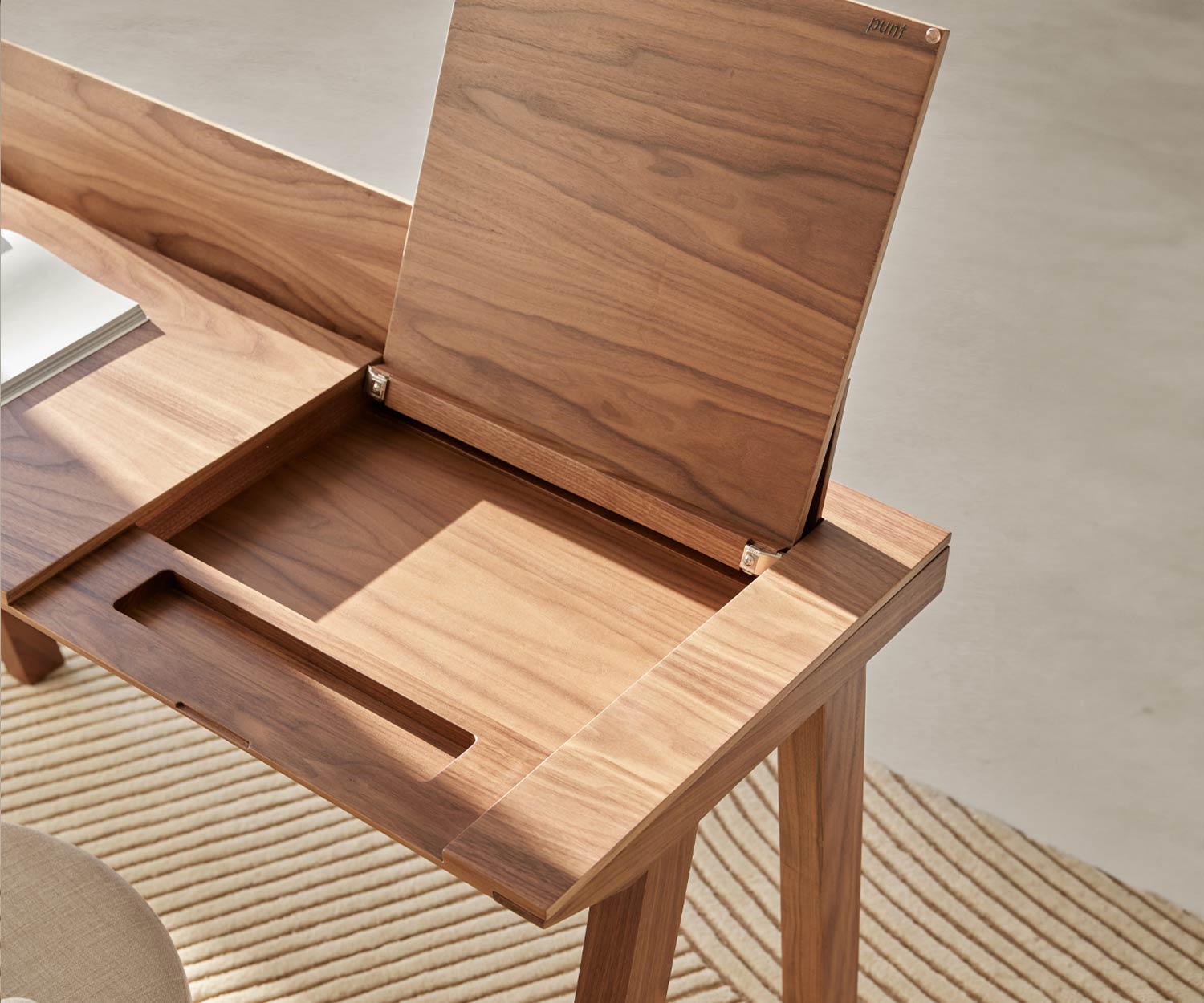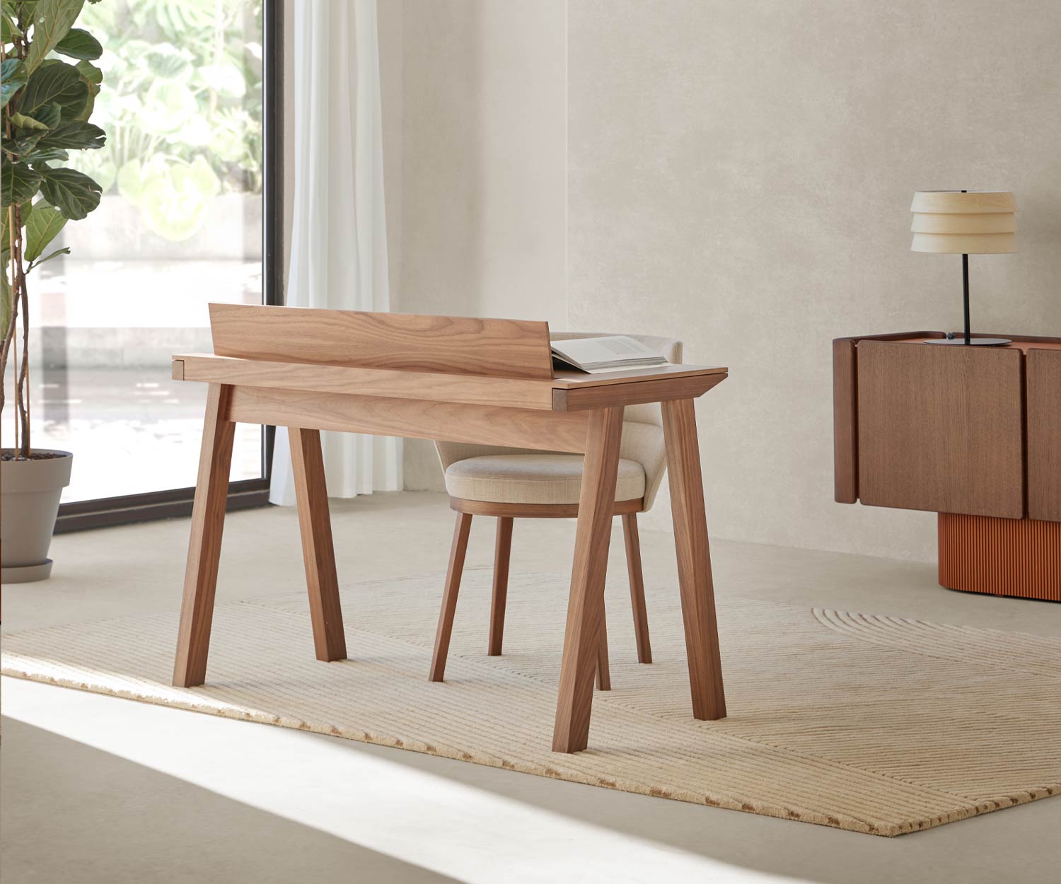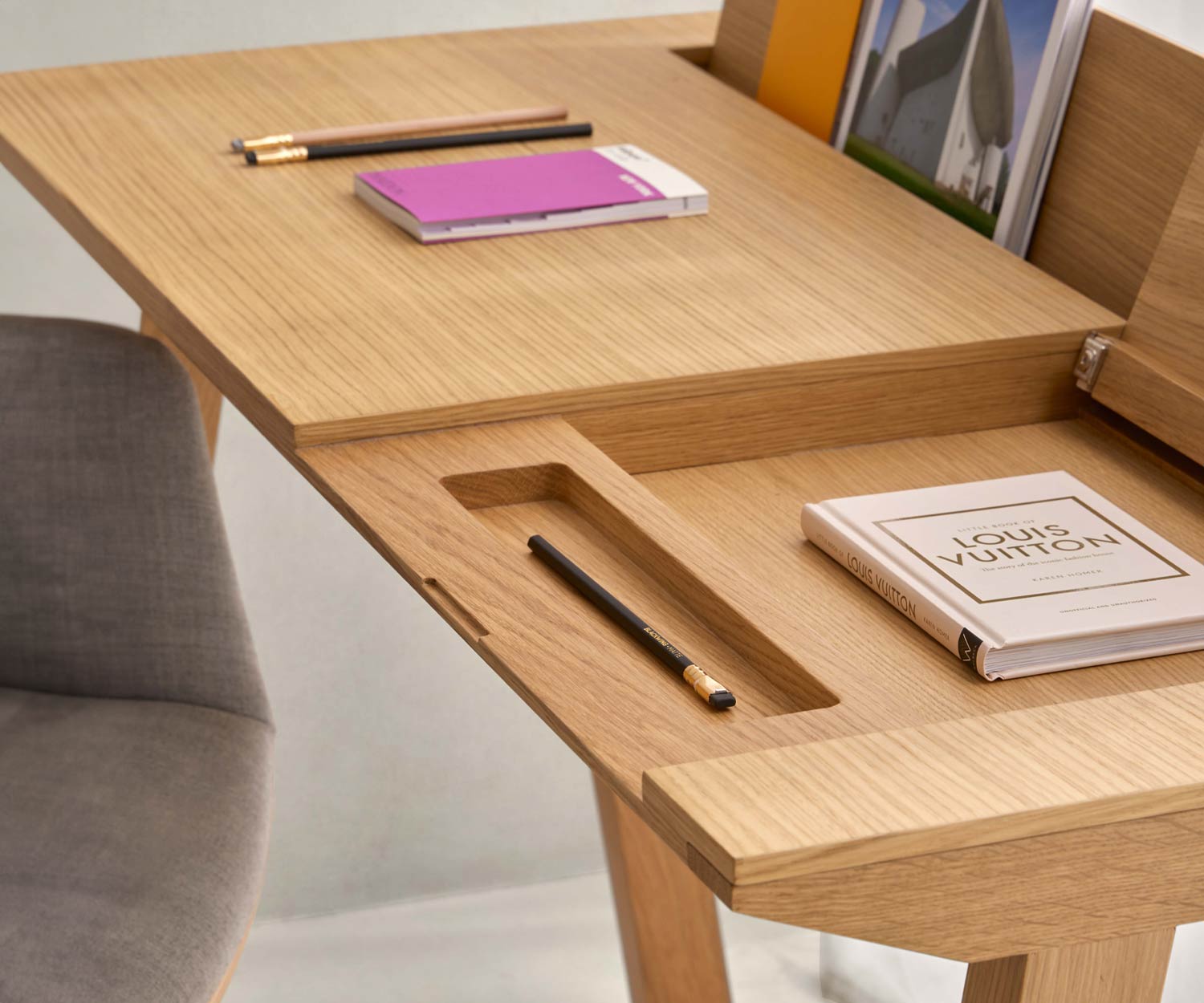 Uniek vormgegeven secretaire Ernest van Punt uit Spanje. Het moderne ontwerp zorgt voor een tijdloze uitstraling en zorgt ervoor dat het bureau gemakkelijk in elke kamer kan worden geïntegreerd. Het frame is gemaakt van massief eiken of walnoot. Het tafelblad heeft een verborgen vak voor kleine gebruiksvoorwerpen. Er is een praktische standaard aan de achterkant die gebruikt kan worden voor tablets, documenten of bladmuziek. Geïntegreerd kabelbeheer zorgt voor onzichtbare kabelgeleiding van de poot naar het tafelblad.