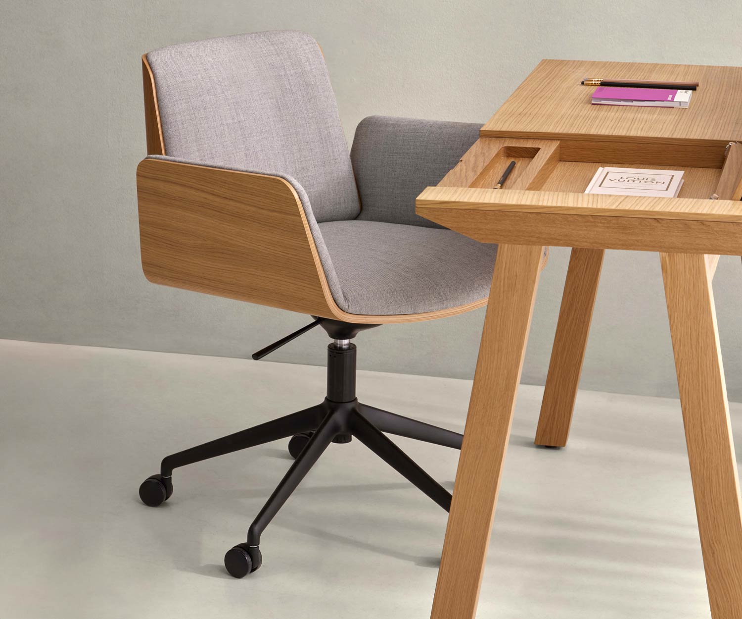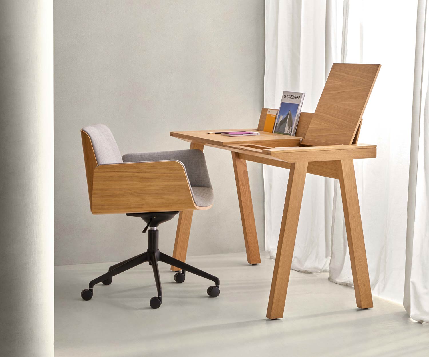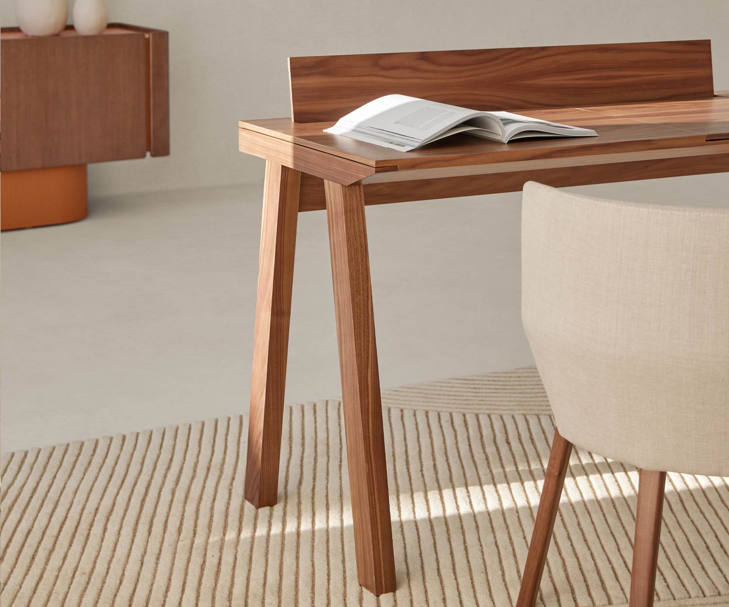 Uniek vormgegeven secretaire Ernest van Punt uit Spanje. Het moderne ontwerp zorgt voor een tijdloze uitstraling en zorgt ervoor dat het bureau gemakkelijk in elke kamer kan worden geïntegreerd. Het frame is gemaakt van massief eiken of walnoot. Het tafelblad heeft een verborgen vak voor kleine gebruiksvoorwerpen. Er is een praktische standaard aan de achterkant die gebruikt kan worden voor tablets, documenten of bladmuziek. Geïntegreerd kabelbeheer zorgt voor onzichtbare kabelgeleiding van de poot naar het tafelblad.